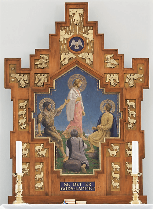 I 1930 skabte den meget værdsatte kirkekunstner Niels Skovgaard, Joakims yngre bror, til Rørdal Kirke i Aalborg en festlig altertavle med titlen “Se, det er Guds-lammet”. Det myldrer med får og lam på altertavlens ramme, så vi også må tænke på den gode hyrde. Johannes Døberen peger i maleriet på Kristus, som kommer gående forbi og altså vises i profil. Foran denne ophøjede skikkelse knæler en rygvendt discipel – en identifikationsfigur for enhver i menigheden. Alle bærer prydede glorier. Billedet er et saligt glimt, hvor Guds engle ses stige op og ned i skikkelse af forgyldte relieffer på altertavlens ramme. Foto er – med tak – fundet hos Niels Clemmensen, der på forbilledlig måde har gennemfotograferet og kommenteret samtlige kirker i Aalborg Stift.