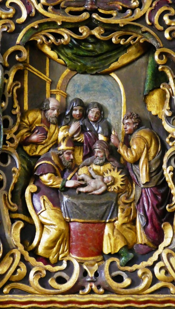 Der er gammel tradition for at tolke Jesu omskærelse som en prototype på den vold, han som voksen skal udstå: Allerede som spæd måtte han altså udgyde sit blod. Desuden vælges motivet som en analogi til barnedåben i den kristne kirke. I danske kirkeudsmykninger fra 15-1600-tallet er der en del relieffer med Jesu omskæring som motiv – sammen med de andre bibelske motiver fra Jesu barndom. Her viser jeg et detaljeret prædikestolsrelief fra 1667, udført til Hammer kirke ved Næstved af egnens berømteste billedskærer Abel Schrøder d. y. Den unge Abel blev født 1602, det år hvor hans far døde af pest. Han udviklede sit talent og videreførte værkstedet med sin mors, sin storebrors og svendenes hjælp og skabte gennem et langt arbejdsliv mesterværker til et halvt hundrede kirker, samtidig med at han i 42 år sikrede familien det daglige brød ved at arbejde som organist i Næstveds Sankt Mortens Kirke. Jeg har udvalgt dette eksempel fra Hammer Kirke på grund af den andagtsfulde grebethed, som står at læse i ansigterne på barnets familie. Kan de ikke minde om en højtidsstemt dansk dåbsfamilie? Foto: Claus Jensen.