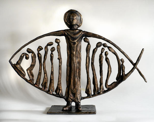 Jeg vælger som fortolkning af enheden i Kristus en bronzeskulptur fra 2014, udført af Issa Kazah, som er opvokset og kunstuddannet og – så vidt jeg ved – stadig bor i Syrien. Den elegante skulptur er formet som en fisk, et af den tidlige kirkes Kristussymboler. Skulpturen hedder ‘Den sidste nadver’ og omfavner tolv skrøbelige personer, svarende til Jesu bordfæller ved påskemåltidet. Det tilføjer skulpturen et særligt betydningslag, at den er skabt af en kunstner fra et mishandlet Damaskus. Titlen ‘Den sidste nadver’ er som bekendt også titlen på Klaus Wivels bog fra 2013, hvor de kristne kirkers fortrængning fra især Mellemøsten er beskrevet. I en verden med mange former for forfølgelser af religiøse og etniske grupper viser statistikker nu, at kristne menigheder er de mest forfulgte. – Hvordan kan det engang blive til en erfaring, at vi alle er ét i Kristus?