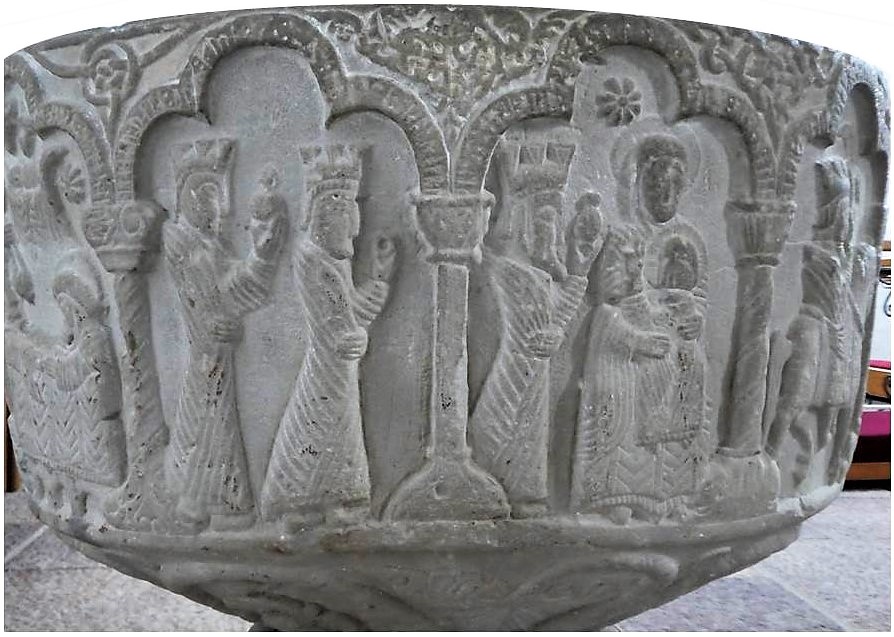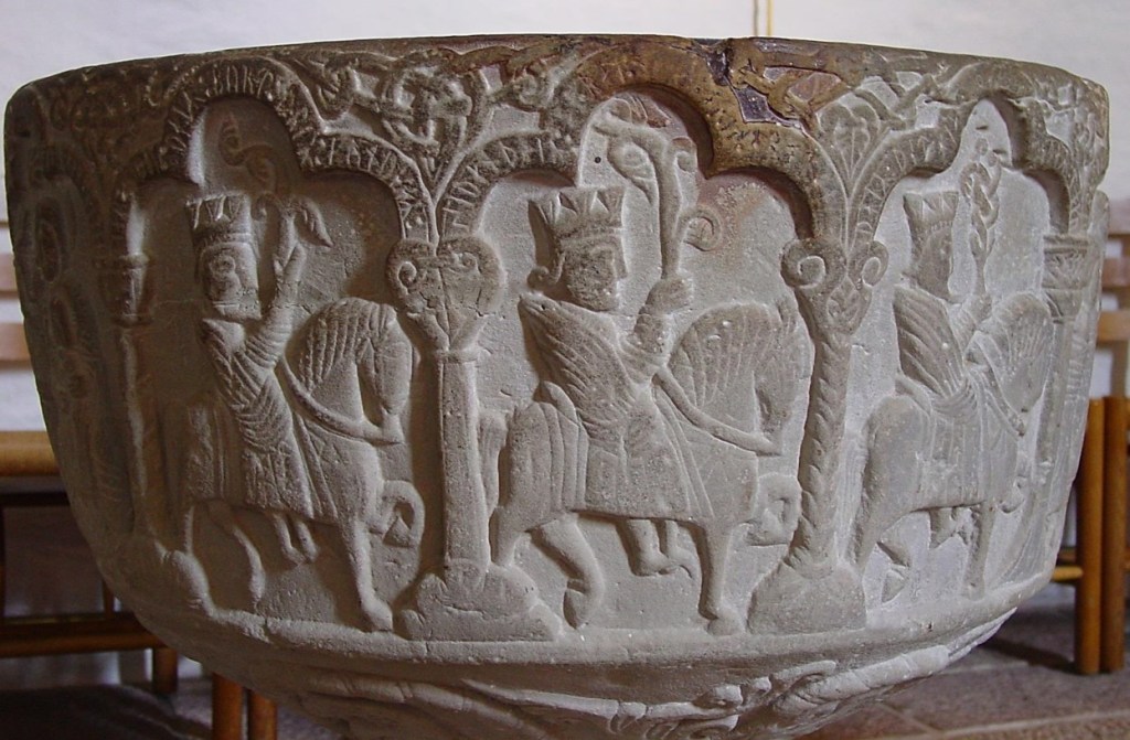Man kan beruse sig i Danmarks mange herlige billedtolkninger af Kongernes tilbedelse, men mit valg er let: Sommerture til danske øer har bl.a. ført mig til Aakirkeby på Bornholm, og jeg har lyst til at invitere alle med hertil. Skønt lige langt fra alle Bornholms turistmagneter er Aa Kirkes romanske døbefont i sig selv en pilgrimsrejse værd. Her kan vi beundre den døbefont, som mester Sighrafs måske så tidligt som 1175 har skabt i blød gotlandsk kalksten. Stenmesterens navn står for runekyndige at læse på en af relieffets søjler. Under slyngornamentik og arkadebuer ses den fineste billedserie med det fornemme besøg i Betlehem. De kronede skikkelser, som her er aldeles strunke, frembærer kostbarheder til barnet, som rank tager imod på Marias skød. Efterfølgende vises kongernes bortrejse til hest, hvor gaverne er byttet ud med grønne vækster (?) som hyldestens symbol. Billedrækken er ledsaget af forklarende tekstbånd, vel at mærke altså i runeskrift.