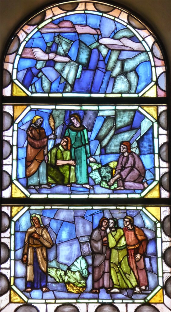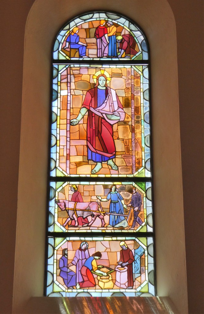 Lignelsen læses som en allegori, og allegorien udmales led for led af billedkunstneren Kræsten Iversen i en smuk serie på fem glasruder, som han o. 1953 skabte til Skt. Nicolai Kirke i Rønne. Hver af de fem store ruder har tre delvist fortællende felter, som kan udfordre Bornholmsturister på en regnvejrsdag. Den basale rude med billedet af sædemanden afkodes nok umiddelbart, men dernæst følger vi kunstneren ind i de allegoriske billeder og holdes for øje, hvordan sæden falder hhv. på vejen, på klippegrund, blandt tidsler og i den gode jord. Vi kunne haste til ruden med den gode jord med sæden som bærer mange fold, og beroliges af at det hele kan ende godt. Jeg lader mig imidlertid standse af en smuk rude i blå farver. Det er ruden, som omhandler sæden, der faldt på klippegrund: “og det kom straks op, fordi der kun var et tyndt lag jord; og da solen kom højt på himlen, blev det svedet, og det visnede, fordi det ikke havde rod.” Øverst i ruden ses det golde, blålige klippelandskab. Derunder scenen med de triste agerbrugere med det skuffende udbytte, tv holder en mand den vissengule plante frem. Nederst anskueliggør Kræsten Iversen, hvad meningen med det alt for tynde jordlag kan være, på baggrund af Markustekstens ordlyd: “De, der bliver sået på klippegrund, er dem, der straks tager imod ordet med glæde; men de har ikke rod i sig, de holder kun ud en tid, så når der kommer trængsler eller forfølgelse på grund af ordet, falder de straks fra.” Glasmaleriets nederste scene kan læses som en tilsvarende case med en sladrende og anklagende gruppe th. og en ensom, fortrydelig person tv. Er det ham, der straks faldt fra, fordi der kom trængsler? – Det er et tankevækkende kunstværk, men hvilke tanker sætter det i gang? Hos mig vækker det den tanke, at hvis jeg vil moralisere over forkyndelsens skuffende udbytte, har jeg nok at gøre med at gribe i egen barm. Foto: Claus Jensen.