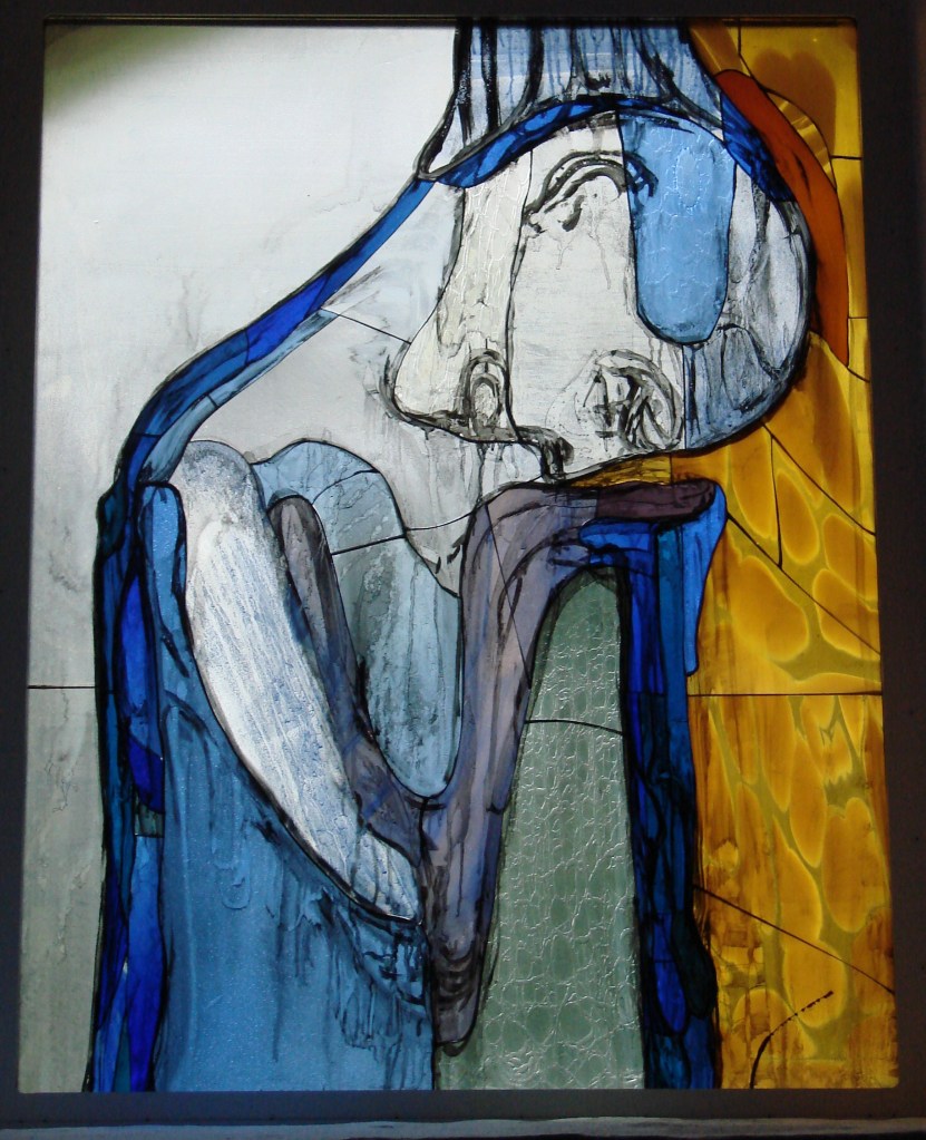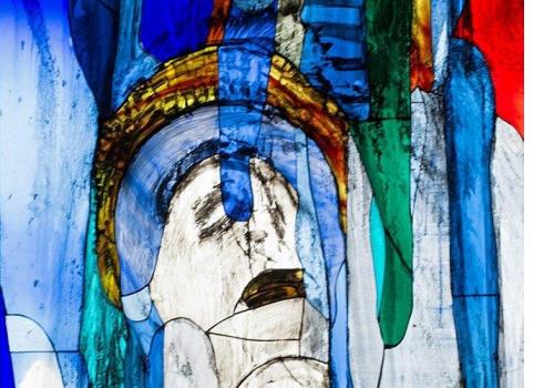 Også glasmosaikker viser Jesu dåb, allersmukkest når lyset på en klar dag vælder igennem glasset. Kirkekunstneren Peter Brandes har i 2015 helliget dåben en stor udsmykning på hele 7 ruder i Hvidbjerg Vesten Å Kirke i Thy. Lyset ude- og oppefra passerer det blå glas, fylder kirkerummet og strejfer kirkegængeren. Nogle af ruderne er dristige og viser dåben ikke blot som en ydre begivenhed, men som en inderlig, åndelig, ja mystisk begivenhed. Dåbens kærlighedserklæring mellem himmel og jord flytter grænser. Foto: Claus Jensen.