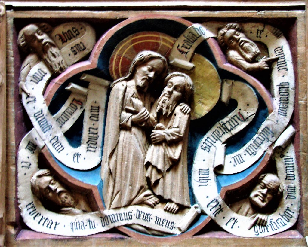 Det udvalgte billede er fundet i koret blandt Roskilde Domkirkes 46 helt vidunderlige kannikestole fra 1420. Det er gribende at se, hvordan den træskårne fortolkning fremhæver Kristi omsorg for “hiin enkelte”: Som situationens generøse herre fører Kristus Thomas’ højre hånd hen til sidesåret, skønt Thomas nu synes hinsides ethvert forlangende. Og se, hvor kærligt og støttende Kristus lægger sin hånd om Thomas’ skulder!