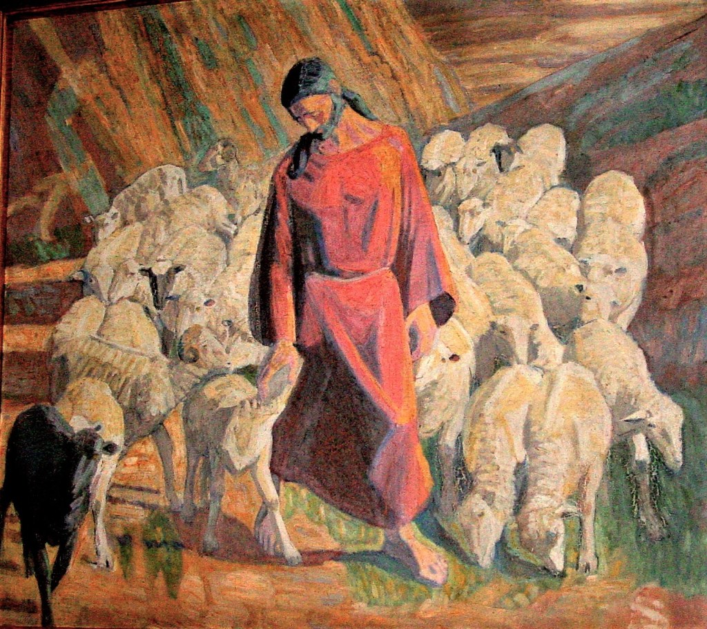 Jeg viser her min absolutte yndling: Niels Larsen Stevns’ maleri fra 1920 i Hvam Kirke i Himmerland. Stevns’ maleri er ikke længere i brug som alterbillede i Hvam, men hænger i skibet. Stevns var igennem sine mange yngre år assistent for Joakim Skovgaard, men her viser han sit eget talent for forkyndelse med lys og farver og for at skildre bevægelse med øjebliksbilledets troværdighed. Vi oplever en dynamisk situation, hvor fåreflokken er rask undervejs i det barske og uoverskuelige landskab, helt afhængig af hyrdens ledelse og omsorg. Her er både styrke og ømhed, et lam bliver kærtegnet af hyrdens hånd. – Og det sorte får er også med. Foto: Claus Jensen.