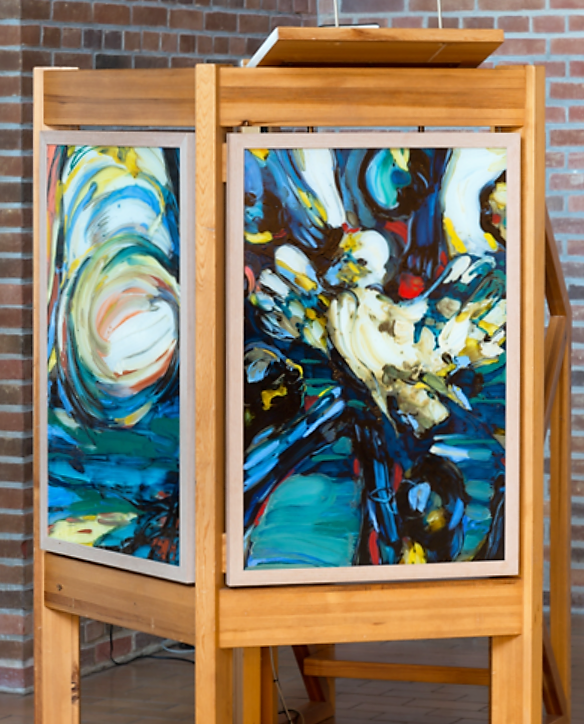 Ånden kan også virke i det skabende menneskes kunstneriske virke; ideelt set er ethvert stykke kirkekunst vel et billede af Helligåndens virke. Som afgrænset symbol bliver Helligånden som bekendt – af gode bibelske grunde – gerne anskueliggjort som en due eller som vind, og der flyver sandelig mange smukke og kraftfulde duer i danske kirkeudsmykninger. Jeg skal træffe et valg: Den litauiske kunstner Vilmantas Marcinkevicius (f. 1969) har 2018 udsmykket Hedeager Kirke i Herning bl.a. med glasmalerier på prædikestolen. Her har han begået en helligåndsdue, der virkelig synes at hvirvle støvet op. Foto er fundet på kirkens hjemmeside. Tak for det!