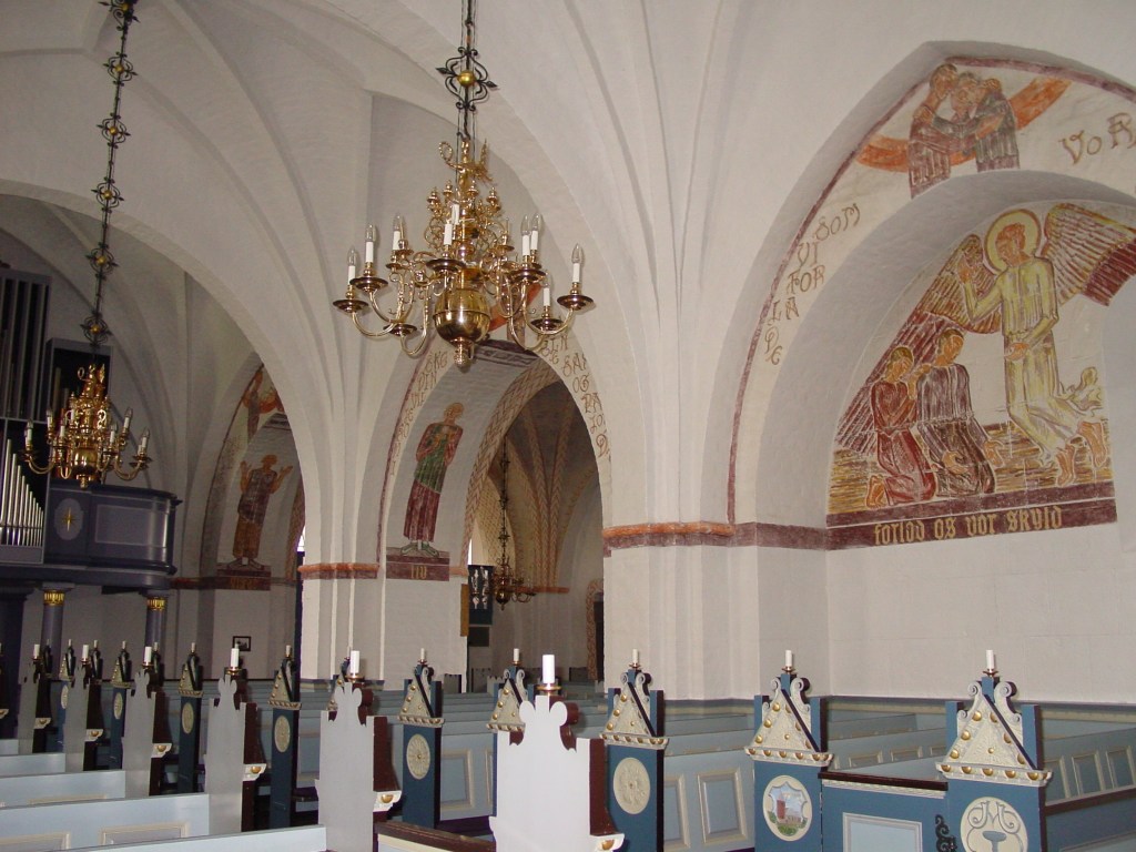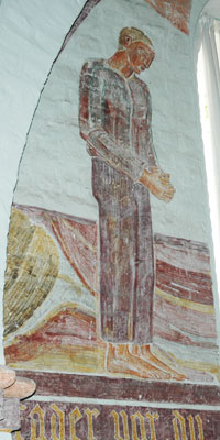 Fra 1922 udsmykkede Elof Risebye Vejlby Kirke på Djursland med højtidsfulde fresker med Fadervor som motiv, hvor anonyme skikkelser bøjer hovederne let i bøn, måske under en engels beskyttelse. Her vises et udsnit. Foto: Claus Jensen.