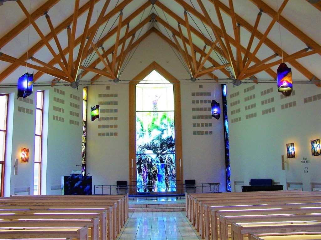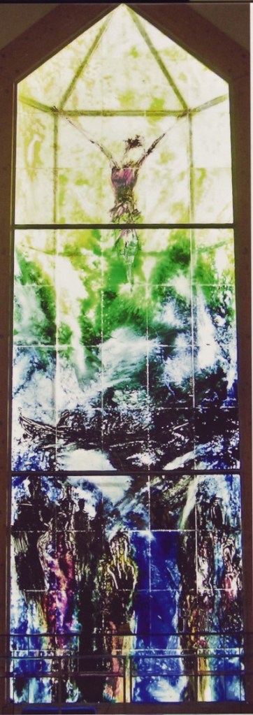 Nærbilledet nedenfor er hentet i Torben Weirups smukke billedbog med fortælling om Trondur Patursson: “Høje himle – dybe grunde”. Patursson har foruden flere færøske kirker udsmykket fem kirker i Danmark. Iflg. glaskunstens ekspert Per Hebsgaard er Patursson den kunstner, som bedst forstår sig på at arbejde med glasmaleri.