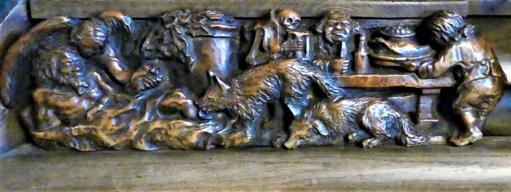 En af Danmarks bedste billedskærere i nyere tid var “fløjte-Emil” fra Ryslinge. Han havde spillet på fløjte til fester og måtte så – uden større musikuddannelse – påtage sig et arbejdsliv langt at fungere som organist i valgmenighedskirken Nazarethkirken i Ryslinge. Musikken kan vi ikke få at høre, men vi kan se hans billedkunst. Emil Hansen skabte rammen til valgmenighedskirkens altertavle og andet uimodståeligt livligt inventar. I 1966 udskar han kirkens prædikestol med lignelsen om Det store gæstebud som hovedmotiv. I de smalle felter nederst på prædikestolen var der frirum for andre scener, og her møder vi Den rige mand og den fattige Lazarus, som vises her. Den velnærede, rige mand har dødningen til bords, men det har han endnu ikke opdaget. Den fattige Lazarus ligger på jorden bag en skraldespand med bidske hunde som eneste selskab. Nej, der er alligevel én til: En engel bøjer sig omsorgsfuldt ned over den arme. Lazarus’ lidelse er forbi. – Forbindelsen eller kontrasten til prædikestolens hovedmotiv Det store gæstebud er, at Gud sender bud efter staklerne. Guds festbord er dækket, og hans sal skal være fuld.