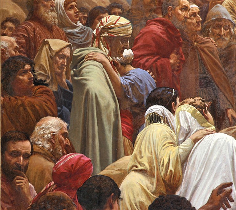 Jesu talestof i Lukas’ sletteprædiken løber her parallelt med Matthæus’ bjergprædiken, som har inspireret en lang række kirkelige kunstværker. Jeg viser et foto af Henrik Olriks store billede af bjergprædikenen fra 1883 i Skt. Matthæus Kirke i Kbh. Denne gang zoomer jeg ind på et udsnit af folkeskaren, hvor Jesu eftertænksomme tilhørere er skildret med stor psykologisk indlevelse. Der er hårde ansigter iblandt, måske fordømmende? De fleste tilhørere er mænd. Mit blik fanges af en gruppe, hvor en ung pige søger ind i en ældre mands – vel faderens – favn. Kan vi læse denne detalje som en fortælling om den barmhjertighed, som Jesus forkynder og forlanger af os, at vi virkeliggør?
