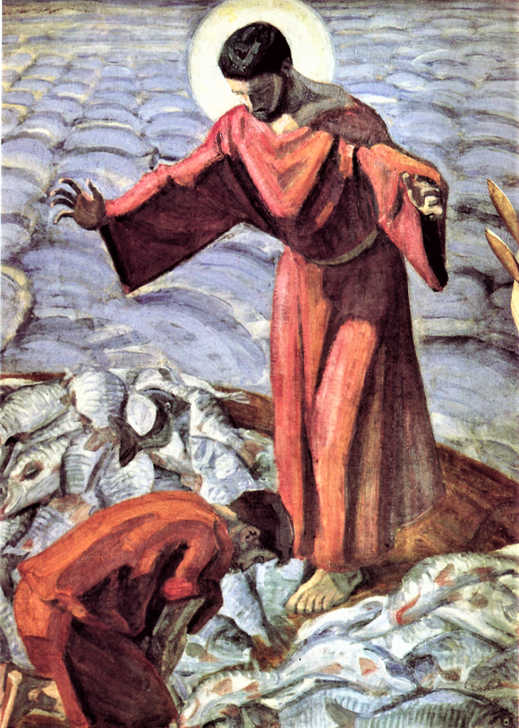 Danmarks uovertrufne billedtolkning af Peters fiskedræt har siden 1916 kunnet iagttages i Viuf Kirke ved Kolding. Det er Niels Larsens Stevns‘ skildring af det øjeblik, hvor Kristus taler til den tilbedende Peter: “Frygt ikke! Fra nu af skal du fange mennesker”. Baggrunden er det uendelige, bølgende hav, der spiller i lyset fra himmelen. I forgrunden er Peter, som midt i denne gudsvelsignelse af store, blanke fisk bøjer sig rystet ned mod Kristi nøgne fod. De naturalistiske størrelsesforhold er fraveget, idet maleren har gjort forgrundsfiguren lille for desto tydeligere at vise Kristi suverænitet. Kristusskikkelsen rejser sig monumental og skulpturel helt op til billedets overkant som selve velsignelsens inkarnation. Han breder arme og hænder vidt ud over sit menneskebarn og lader sit ansigt lyse over det. – Foto er hentet i Mikael Wivels uundværlige bog om Niels Larsen Stevns: ‘Lysets tøven’.