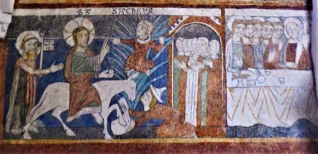 Denne gang skal vi se et fint og meget gammelt kalkmaleri fra Keldby Kirke på Møn, hvor Zakæus’ navn tilmed er skrevet over den lille figur midt i frisen. Sekunderet af apostelfyrsten Peter med kæmpenøgle rider Jesus med korsglorie årvågen og velsignende frem mod påskens drama og hyldes undervejs af en jøde (med spids jødehat), som breder sit klæde på vejen under det hvide ridedyr. Til højre for Zakæus ses Jerusalems port med den hilsende folkevrimmel, og derefter følger nadverbordet med Jesus og apostlene.