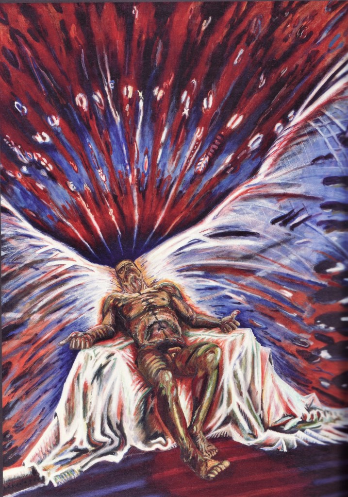 Kunstneren Anders Kirkegaard (f. 1946) er på vej med et stort alterbillede til Vejles Sct. Nicolai Kirke og har også tidligere fordybet sig i kirkekunst. Hans reflekterede arbejder med eksistentielle og religiøse spørgsmål er aldrig skønmalerier, snarere ubehageligt grelle, drevet af anfægtelser, undertiden med stødende Kristusidentifikationer. Anders Kirkegaard har i 1980’erne været optaget af spørgsmål om frelse og fortabelse med særligt udgangspunkt i ‘Det gamle spil om enhver/Jedermann‘. I arbejdet med ‘Portræt af enhver, men mest Jesus‘ har han skabt det viste maleri med titlen “Den sejrende? Den fortabte? Alene!” Maleriet kan læses som et billede af den nøgne eksistens, der angstfyldt anråber Gud og her får lov at falde tilbage og lade sig bære. Hvordan kan man male Guds favnende nåde? Anders Kirkegaard har malet nåden som en metamorfose, repræsenteret ved påfugletrone, engleklæder og fyrværkeri af hvidt lys. Det er vildt!