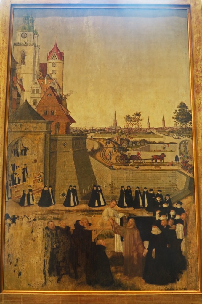 Enkens søn fra Nain er kirkekunstens sjældnest afbillede dødeopvækkelse. Den smukkeste i Danmark er nok glasmosaikken i Stouby Kirke. For to år siden viste jeg relieffet på Skt. Mortens Kirkes dør i Randers, der tolker scenen ind i samtidens begravelsesoptog med købstadens ligbærere. Denne gang drager vi undtagelsesvis udenlands til Luthers Wittenberg, hvor Stadtkirche rummer Lukas Cranach den yngres maleri fra 1569 med opvækkelsen af enkens søn fra Nain som motiv. Lukas Cranach d. y. (1515-1586) malede i sin fars stil, overtog hans værksted og var medskaber på protestantismens billedsprog, og Martin Luther var for øvrigt hans gudfar. Også i dette værk finder underet sted i et bymiljø fra kunstnerens samtid. Vi ser et interessant byprospekt, hvor livet leves, og gotiske spir rækker mod himlen. Der er gjort omhyggeligt rede for arkitektur og detaljer. Slående er den markante, lange række af sortklædte personer som en anskuelsesundervisning i menneskehedens lange begravelsestog. Men der er én, der griber den ulykkelige enke i hånden og byder hendes unge søn at rejse sig af sin båre!