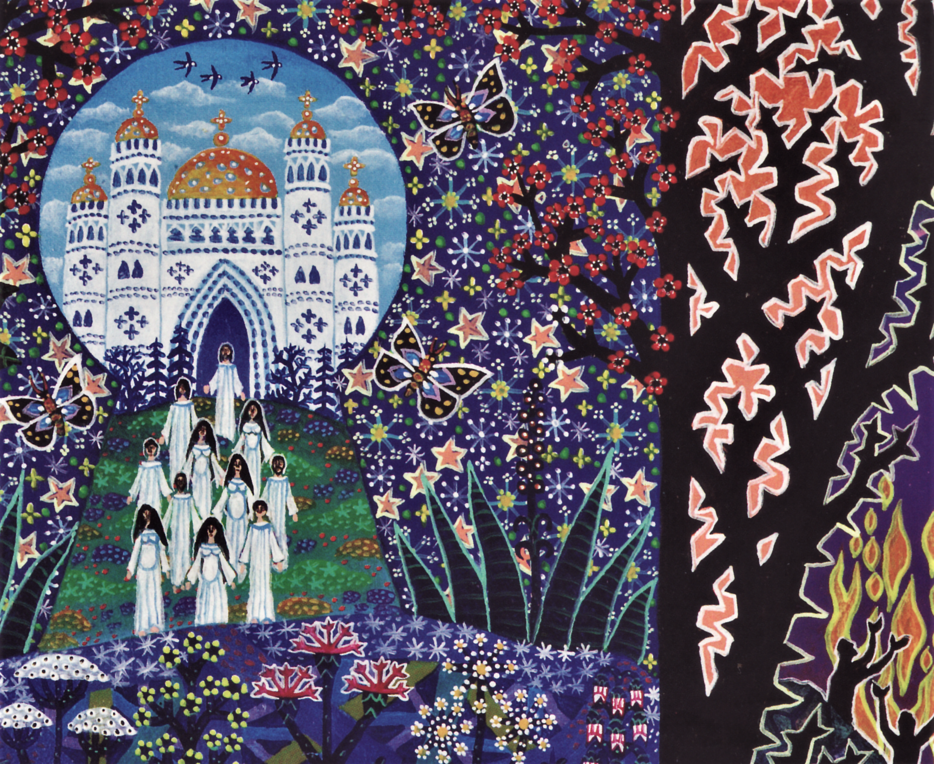 Esben Hanefelt Kristensens eskatologiske billede har dualismen fælles med Matthæuslignelsen. Der findes et ‘udenfor’, som her er skildret symbolsk th. i billedets brændende tornekrat. Vender vi blikket mod hovedfeltet, ser vi Hanefelts poetisk fabulerende Gudsriges-billede med hvidklædte hellige foran en eventyrlig himmelborg i den smukkeste, blomstrende paradishave. Vi kan blive i bryllupsfestens metaforik og associere til den bibelske tanke om sjælen som Kristi brud, den ultimative forening mellem Gud og mennesker. – Billedet er et mindre udsnit af en illustration i den smukke ‘Bogen om Jesu lignelser’, som jeg med glæde har trukket på, især når dagens tekst mig bekendt ikke er omsat i en dansk kirkeudsmykning.