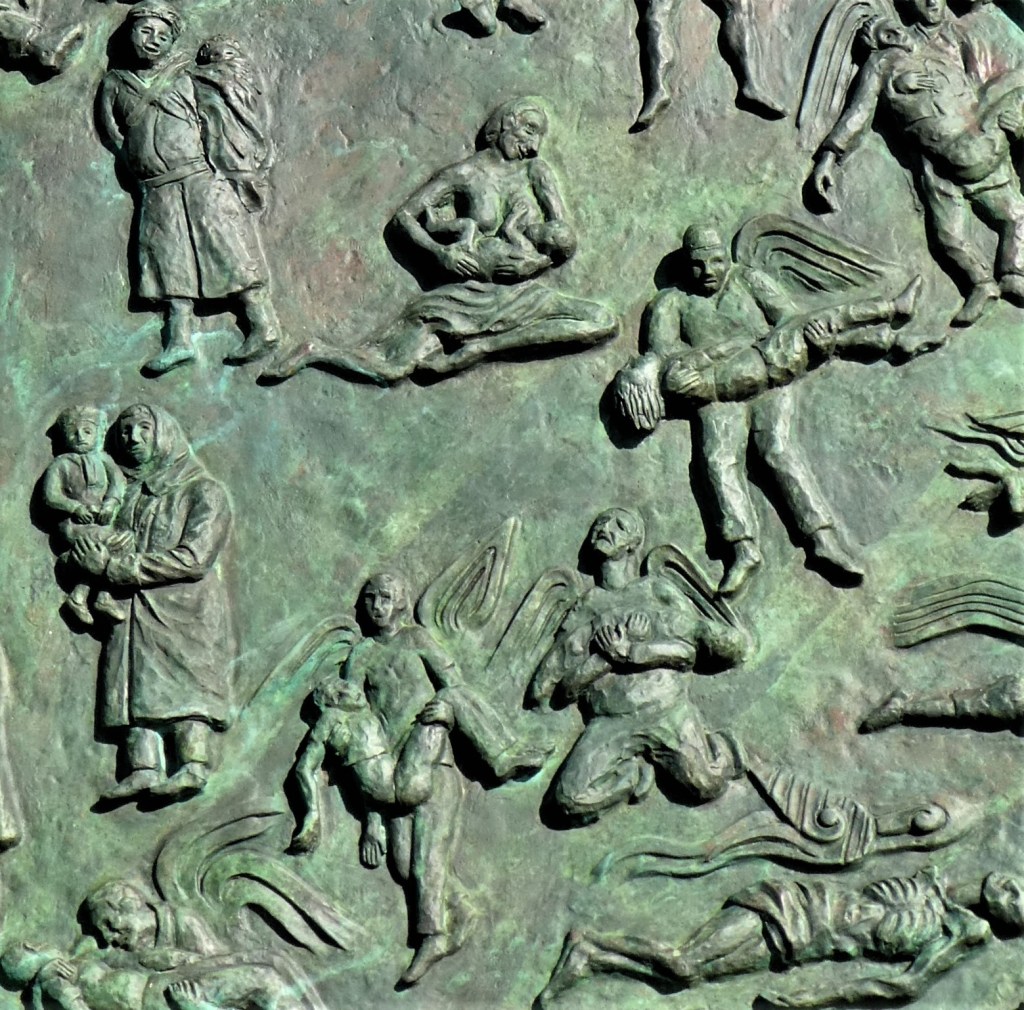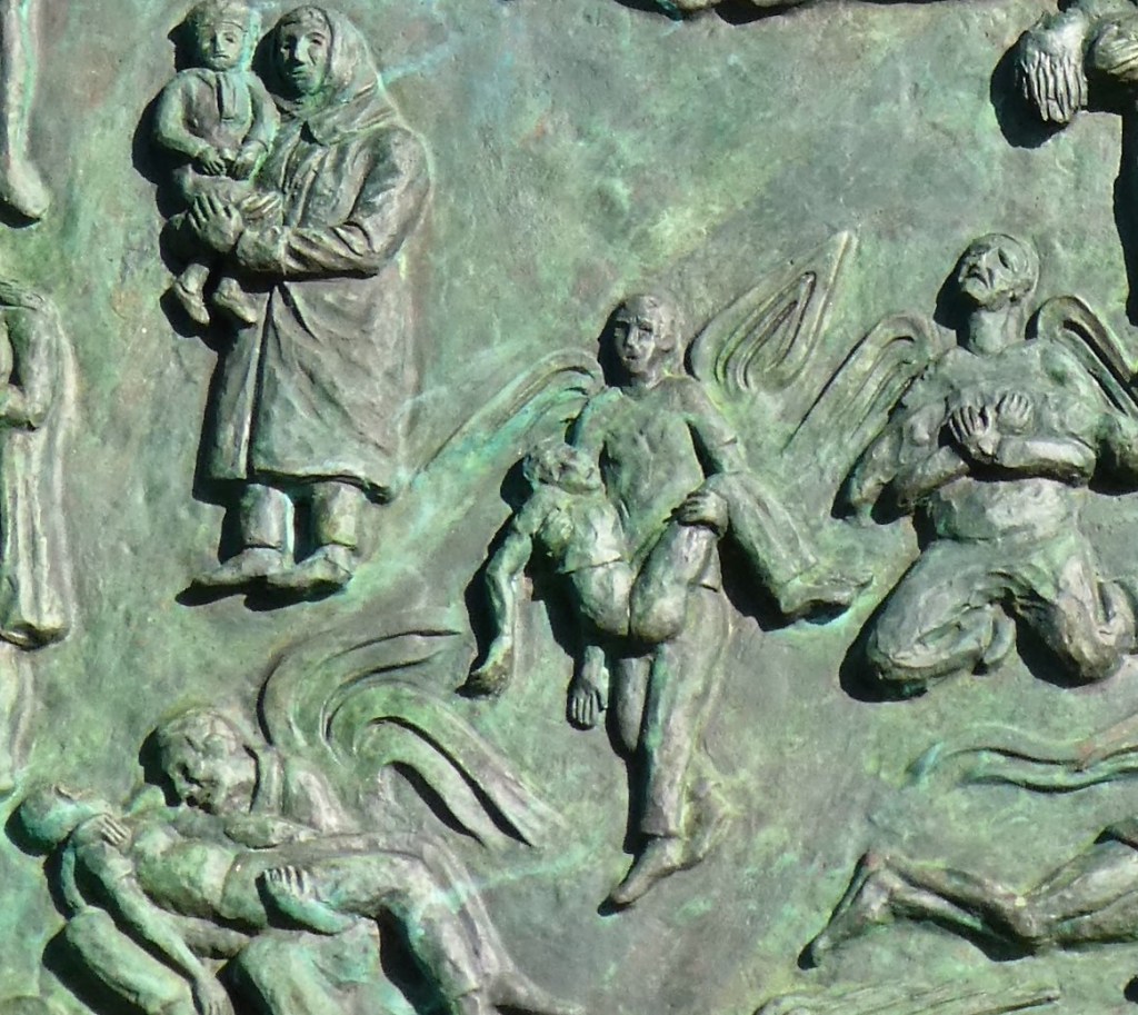 Bjørn Nørgaards store, nye bronzeport ‘Alfa og Omega’ i Christianskirken i Fredericia belyser livets begyndelse, afslutning og nyskabelse i både eskatologisk, evangelisk og individuelt perspektiv. Bjørn Nørgaard refererer på kirkeporten angiveligt til både dåb og begravelse. Her bringer han sin indfølende hyldest til det universelle forældreskab i glæde og sorg. Under et originalt billede af Maria (fremstillet som den store moder) ses en billedflade med mange ekspressive skildringer af forældrekærlighed. Vi ser mødre og fædre fra forskellige kulturer, troligt bærende deres børn. Vi glæder os med en lykkeligt ammende mor, og vi græder med fortvivlede fædre, som bærer deres døde barn og må lægge det i jorden. Bemærkelsesværdigt er det, at de sørgende forældre er vist med vinger! Ikke til at skelne fra engle. Ikke uden englevagt. Forældrekærligheden lever i troens rum. Foto: Claus Jensen.