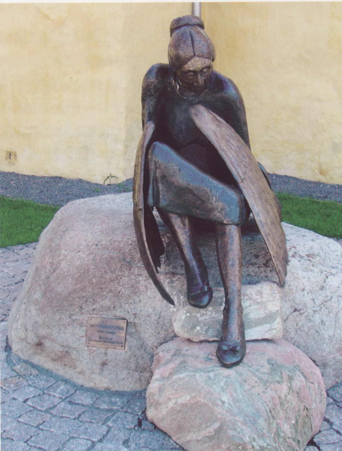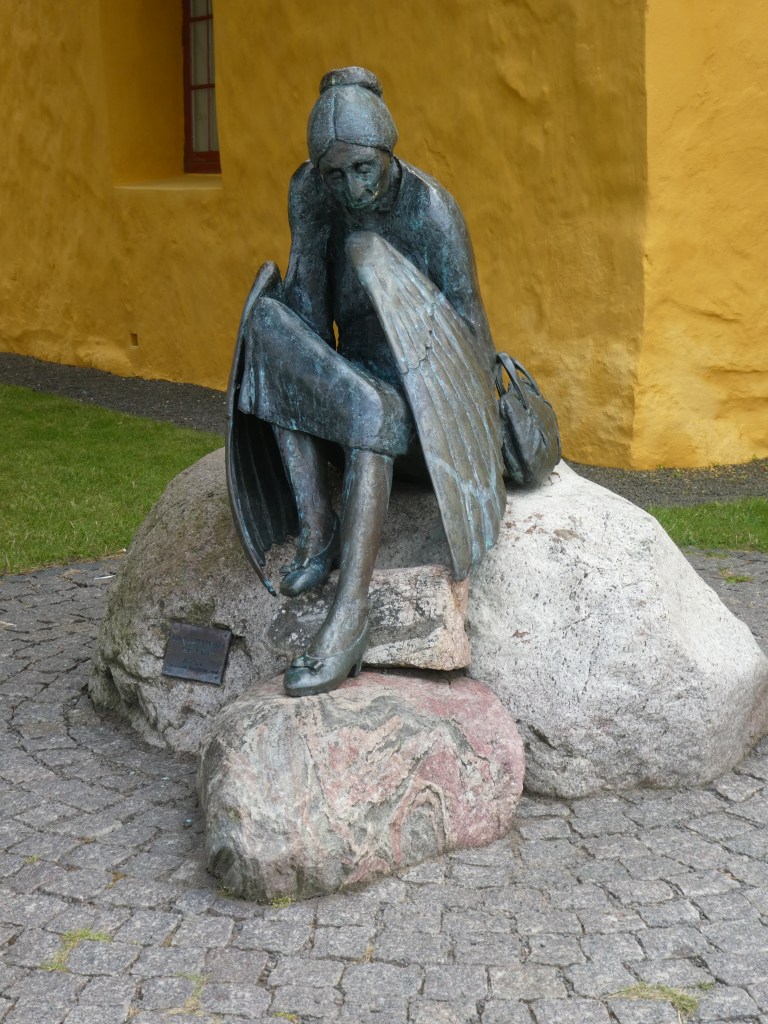 Det valgte billede viser en bronzeskulptur med titlen ‘Metamorphose’, placeret på en sten foran Allinge Kirke på Bornholm. Vi ser her en sagtmodig lille kirkegænger med håndtaske og søndagssko, sunket ind i sig selv, fjern? Hun er – måske til sin egen forundring – blevet hædret med englevinger. Saligprisningerne må lyde for hende! Den både alvorlige og humoristiske skulptur er skabt af keramiker og billedhugger Arne Ranslet (1931-2018). Fra 1950’erne havde han værksted på Bornholm sammen med sin hustru kunstneren Tulle Blomberg. Med den voksende internationale anerkendelse gik han fra keramikken over til at arbejde med større bronzeskulpturer, som pryder det offentlige rum i flere europæiske byer.