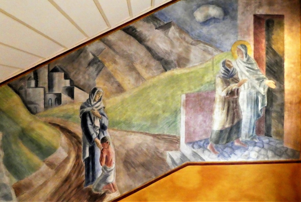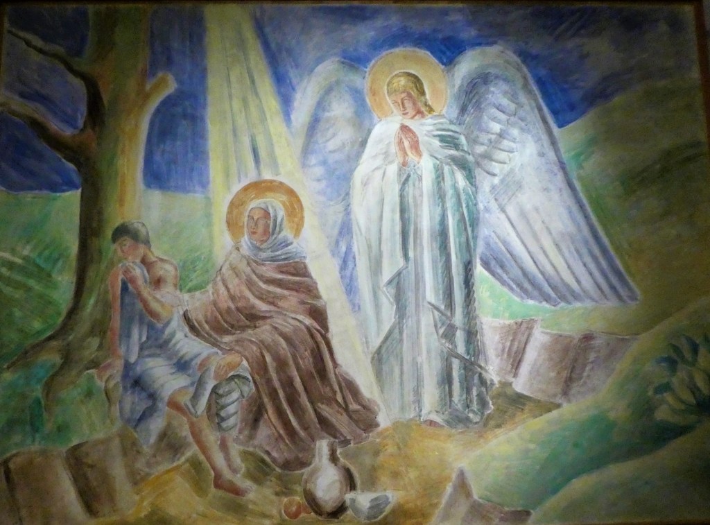 Denne gang vil jeg omtale Jais Nielsens (1885-1961) store katolske fresko fra 1935 med eksplicitte citater fra Mt. 25. og barmhjertighedsgerninger som motiv. Kunstværket har til huse i den tidligere katolske institution Skt. Elisabeths Hospital på Amager, som nu er et kommunalt psykiatrisk ambulatorium. Her står på væggen bl.a. (på latin) “KOM DU MIN FADERS VELSIGNEDE. DU BESØGTE MIG DA JEG VAR SYG. JEG VAR SULTEN, OG DU MÆTTEDE MIG”. Man kan i åbningstiden diskret gå ind fra gaden og beundre den gigantiske freskoudsmykning i trappearealet, restaureret af Nationalmuseet. Her vises som personifikation af barmhjertigheden den katolske helgen Elisabeth af Thüringen (1207-1227), som levede på Frans af Assisis tid og efter hans eksempel. Jais Nielsens stil er her inspireret af Giotto. Man kan evt. forberede besøget ved at læse Dorthe Aggesen og Synne Garffs bog ‘Elisabethfreskerne’, som udførligt oplyser om både helgenlegenden, Elisabethsøstrene og deres hospital og ikke mindst om kunstneren. Her kan jeg blot vise udsnit af legenden, hvor Elisabeth forbinder en syg, hjælper en kvinde med en vanfør dreng og åbner et herberge. Foto: Claus Jensen