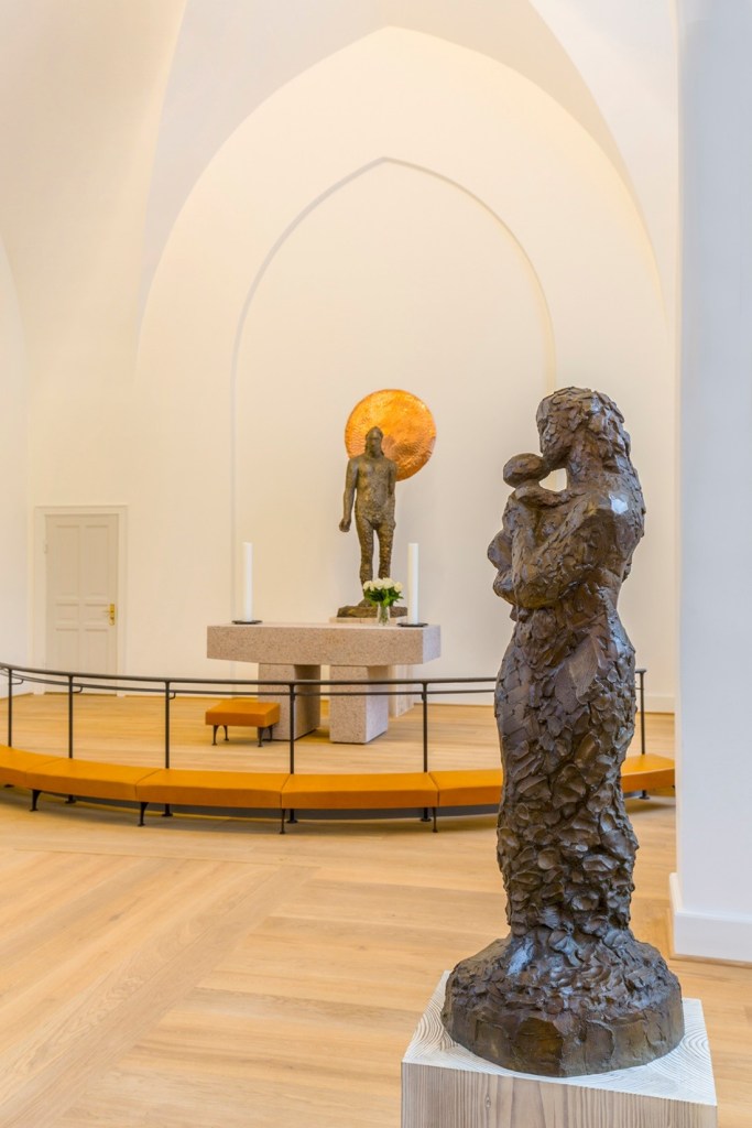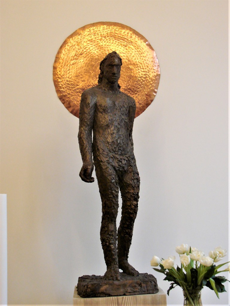 Den nøgne figur er opmodelleret i en klassisk modernistisk stil med en grov og levende overflade, der bærer erindring om kunstnerens arbejde med leret. I kirkerummet kan stofligheden associeres til skabelsesberetningen om, at Gud formede mennesket af agerjordens muld og indblæste livsånde i det. En Kristusfigur er det jo, ‘den nye Adam’, som fuldbyrder Guds plan med mennesket. Figuren tolkes gerne som den opstandne Kristus. Den store gyldne skive af udhamret kobber på væggen bag hans hoved forkynder for os, at dette menneske er bærer af Guds Ånd; den solgyldne ‘glorie’ er opfyldelsens tegn. – Emmauskirken rummer også andre, meget udtryksfulde figurer: Maria med barnet, Maria Magdalene og Kvinderne ved graven. Claus Jensen har fotograferet.