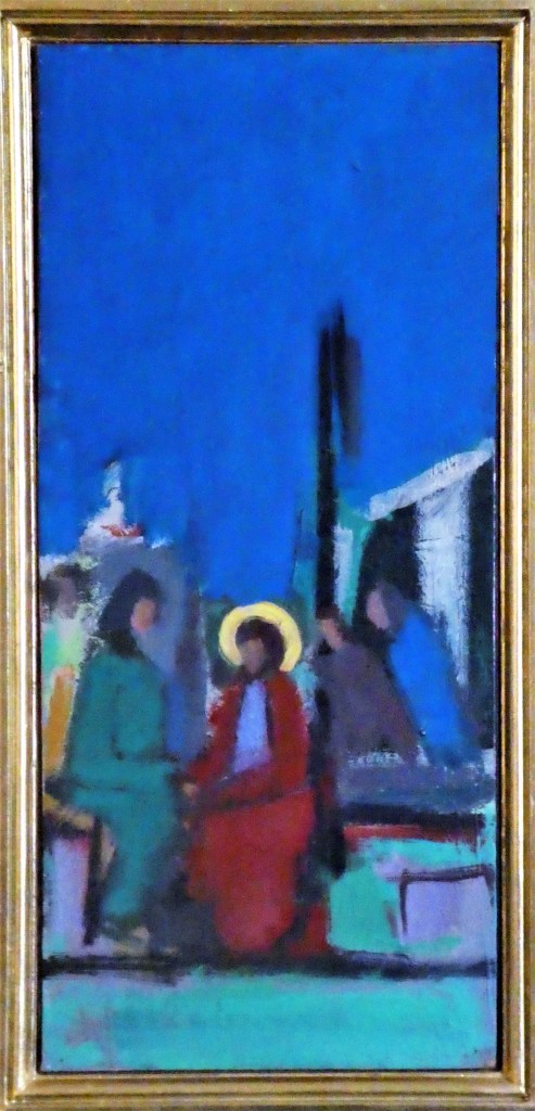Herunder vises et enkelt – sjældent – eksempel på motivets brug i nyeste tid: Frits Gothardt Rasmussens løst monterede modernistiske maleri fra 2017 på prædikestolen i Sønder Nærå Valgmenighedskirke. Her er den rødklædte og glorielysende Kristus placeret i midteraksen. Kunstneren (f. 1950) har udsmykket flere kirker. Foto: Claus Jensen