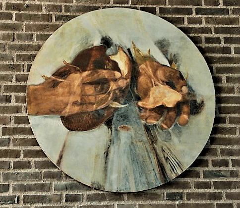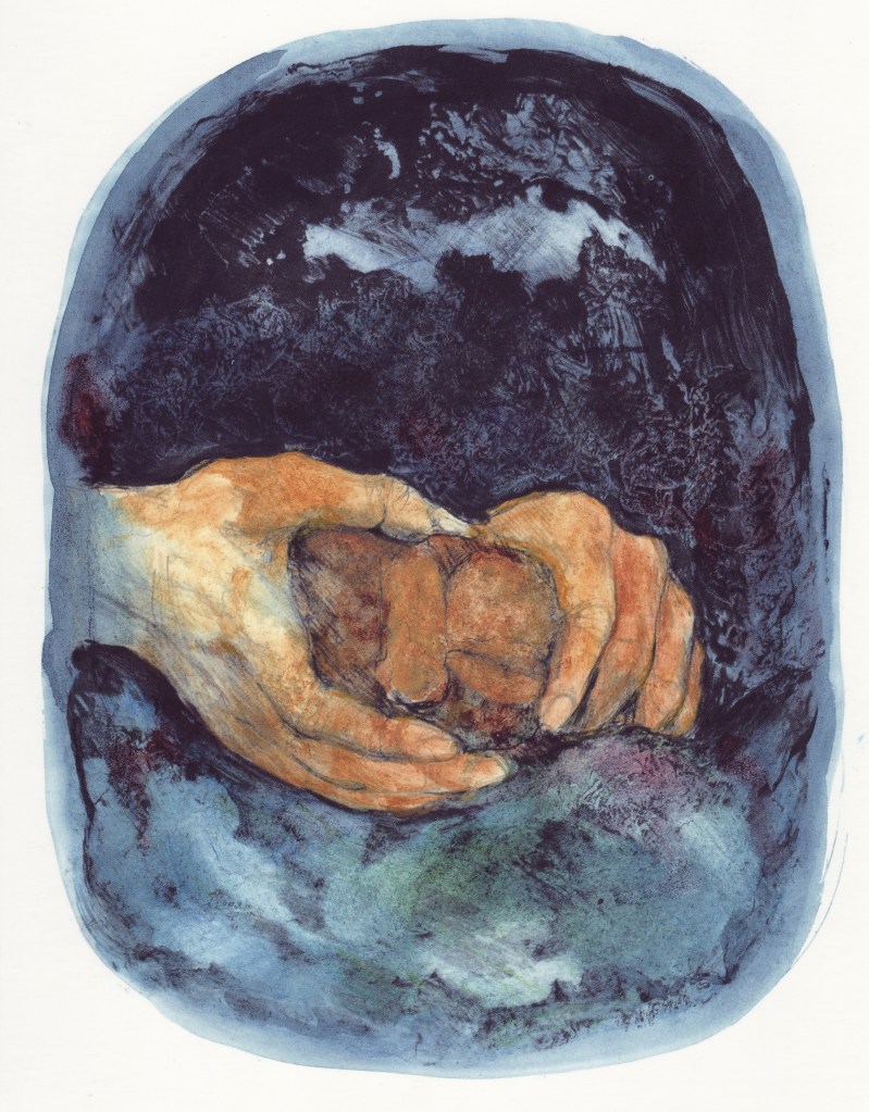 Hos vor store bibelillustrator Bodil Kaalund (1920-2016) har jeg fundet en meget smuk skildring af et gyldent brød, der brydes – med en mørk, men lyssprængt sky som baggrund. Jeg fortolker den dramatiske himmel som både en lidelsesforudsigelse og et løfte om lidelsens overvindelse. – Også i flere kirkeudsmykninger har Bodil Kaalund valgt brødsbrydelsen som motiv, vel nok smukkest i Billund Kirke (1981).