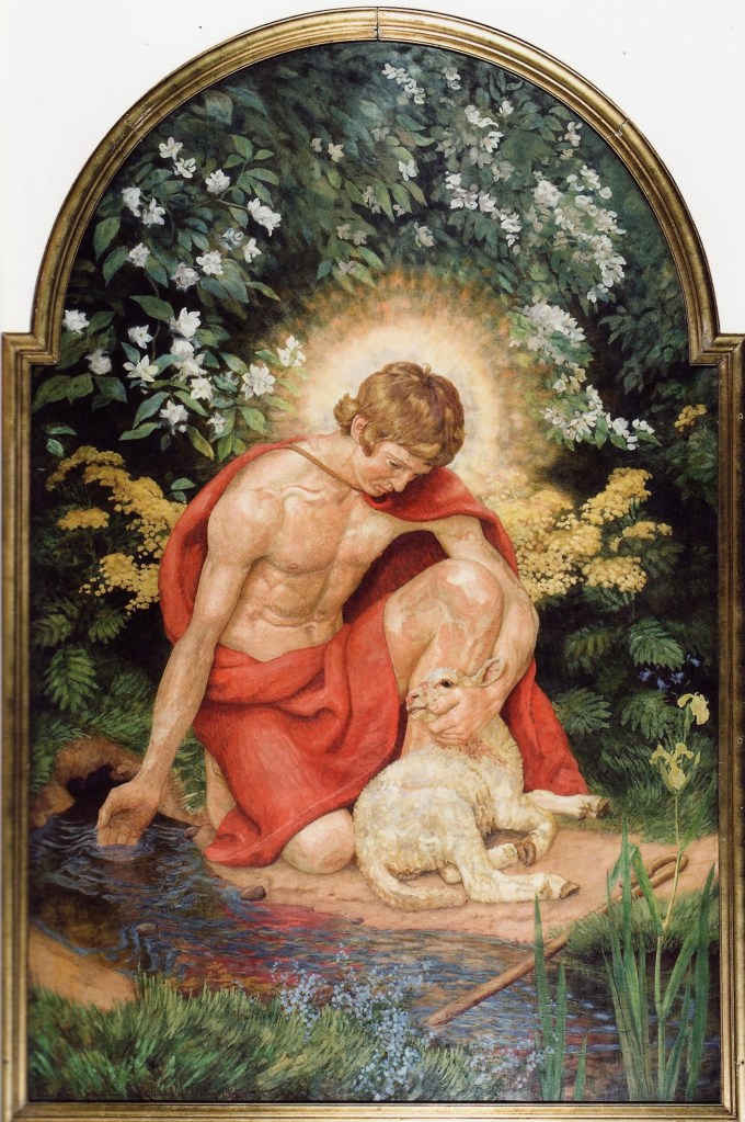 Med baggrund af Det gamle Testamentes salme 23 har Niels Skovgaard i 1910 malet et hyrdebillede, som er ren trøst og salighed: et fredfyldt paradis. Niels Skovgaard (1858-1938) har ligesom sin storebror Joakim skabt flere fortolkninger af Den gode hyrde, også voldsomme billeder af hyrdens kamp mod ulven. I det viste billede er dramaet imidlertid tilbagelagt og afløst af fuldendelse: Under en blomstrende jasmin knæler hyrden i saftigt græs ved et rent vandløb, som spejler himlens blå. Han bader omsorgsfuldt sit skadede lams sår. Billedet er malet specielt til Rigshospitalets kirke, hvor intet kan være mere passende end symboler for omsorg og trøst. Vandløbet er også en reference til dåben som i flere andre af Niels Skovgaards grundtvigsk inspirerede værker. Det er en ung, blond dreng, som udfylder lignelsens rolle som hyrde, udstyret med en stav. Den luerøde kappe sammen med solglorien identificerer ham samtidig som Kristus. I det alvorligt indadvendte udtryk kan læses en dyb bevidsthed om lidelsen. – Niels Skovgaard havde som altid gjort omhyggelige modelstudier: af den muskuløse dreng, af lammet (fra herregården Knabstrup) og af jasminen. Dette idylliske billede findes ikke længere på Rigshospitalet, men på Skovgaardmuseet i Viborg. Det er bl.a. gengivet i museets flotte, store bog “Niels Skovgaard – Maler . Billedhugger . Keramiker . Illustrator”. Rigshospitalets kirke har i mellemtiden fået nutidig, god kunst.