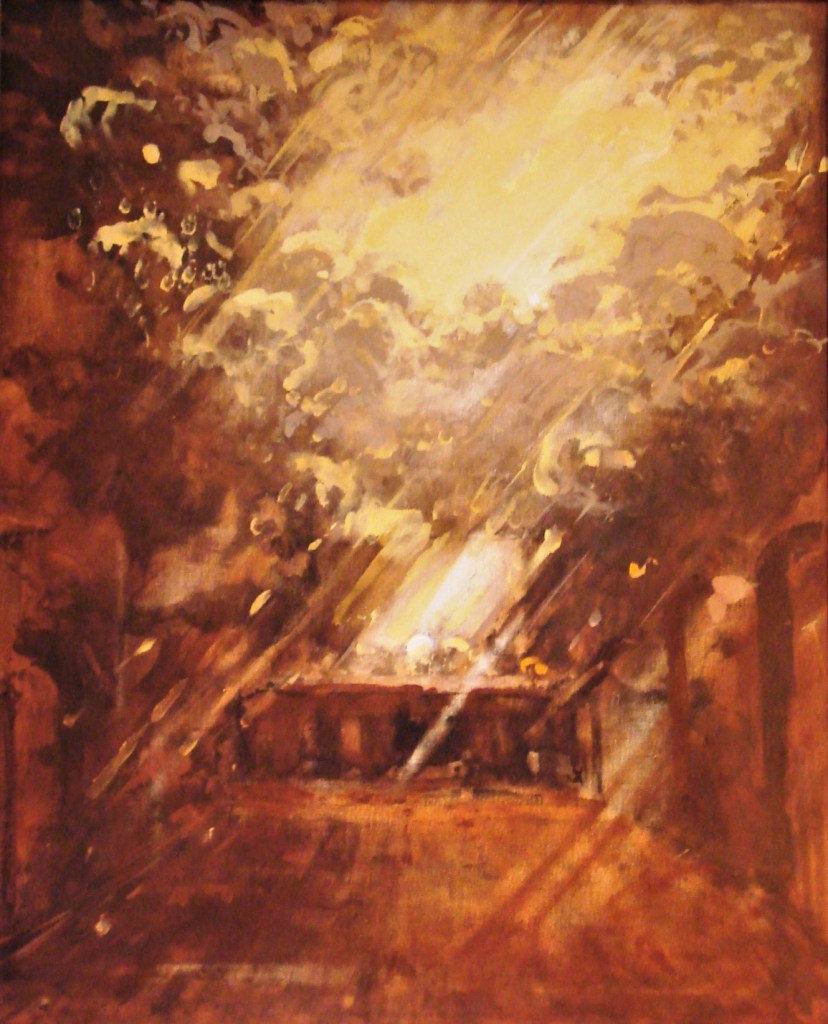 Hvordan kan en moderne kunstner skildre, at himlen står åben over den bedende og hans bordfæller – om ikke ved lys? Merete Barker (f. 1944) skaber med sine delvist nonfigurative malerier et sublimt rum med arkitektoniske træk og dybdeperspektiv, som balancerer mellem erindring og vision. Maleriet “Nadver i det himmelske lys” blev malet til storfeltet i Peder Jensen Koldings altertavle fra 1650 i Skanderup Kirke ved Skanderborg i 2006. Foto: Claus Jensen.