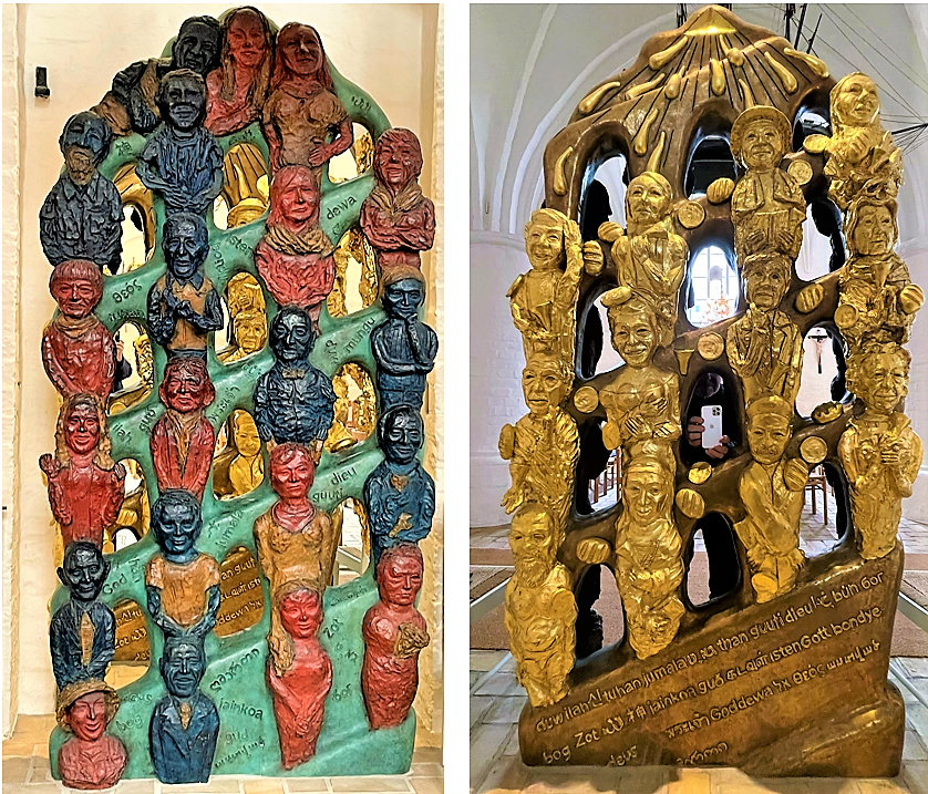 Bjørn Nørgaard har i Helligåndskirken, Den danske kirke i Flensborg, i 2013 præsteret en original bronzeskulptur, som sammenstiller Babelstårn og Pinse for at fortolke pinseunderet: På skulpturens forside ses “Babelstårnet”, bygget af 24 figurer, inspireret af kirkens konfirmandhold 2012. Pigerne er røde, drengene blå, og de har ikke for meget med hinanden at gøre. Guds navn er rundt omkring skrevet på forskellige sprog som en mindelse om, at religion både skiller og samler mennesker. Og nu kommer pointen: Gennem åbninger kan vi se ind til et spejl bag ved skulpturen, hvor vi også kan iagttage, at figurerne på den indre side er forgyldte, glade og deler brød og vin. Nogle er forsynede med en ildtunge, for oppefra regner ilden ned. Det er “Pinseunderet”, vi her bliver vidner til. Tilmed kan vort eget spejlbillede indgå i helheden. Hvad kan det ikke blive til? Foto: Claus Jensen.