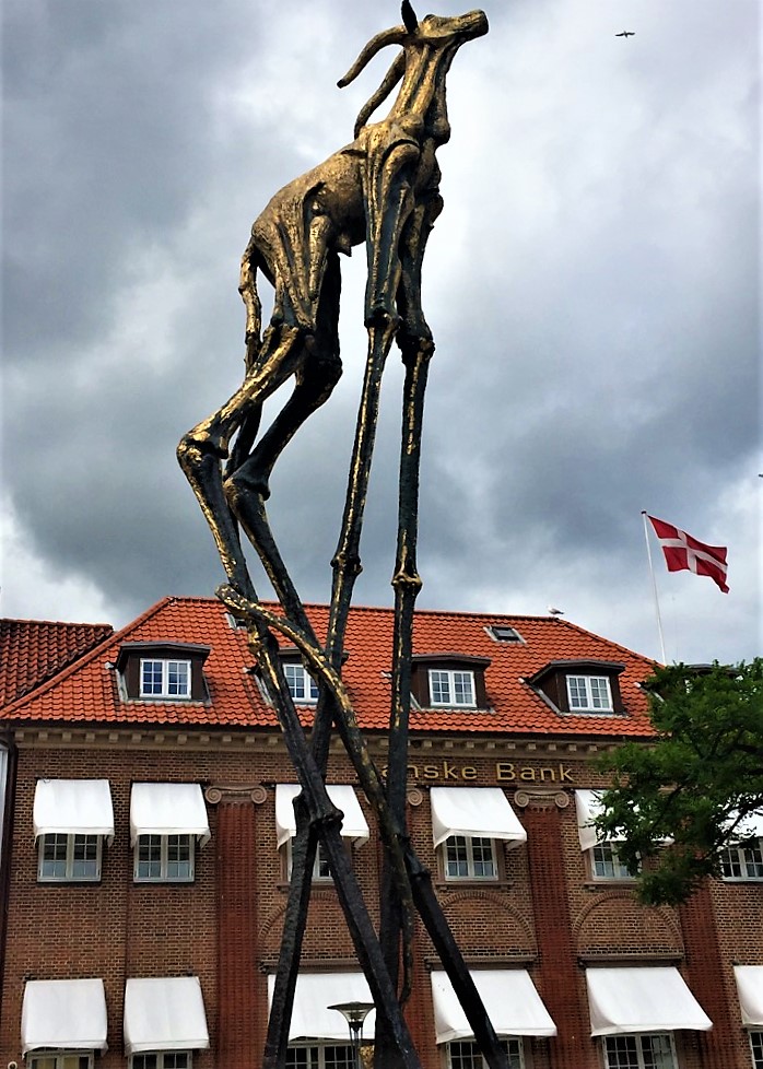 På Rådhuspladsen i Fredericia – foran Danske Banks domicil (!) har man fra 2005 kunnet se en omdiskuteret 8 m høj guldkalv. I 2005 præsenterede den samfundsrevsende kunstner Jens Galschiøt (f. 1954) første gang denne guldkalv i Gent i en kampagne mod grådige bankers uetiske investeringer. At den uhyggelige guldkalv er mere skinnende end tilforladelig, fremgår af dens slangelignende hale og lange, tynde ben. (Faktisk væltede skulpturen under en storm i 2007, før den blev afstivet.) – Aktuelle verdenskriser har nu dramatisk belært os om rigdoms og altings skrøbelighed og er måske ved at flytte vores fokus ?? – I dagens tekst er evangeliet uudtalt og underforstået: Jesus tilbyder et andet livsgrundlag end penge, et liv med Guds nåde som fortegn. – I mit foto ses i baggrunden et vajende dannebrog, og hvad flaget end ellers bruges til, kan korset i flaget måske også være en påmindelse om at leve med nådens fortegn.
