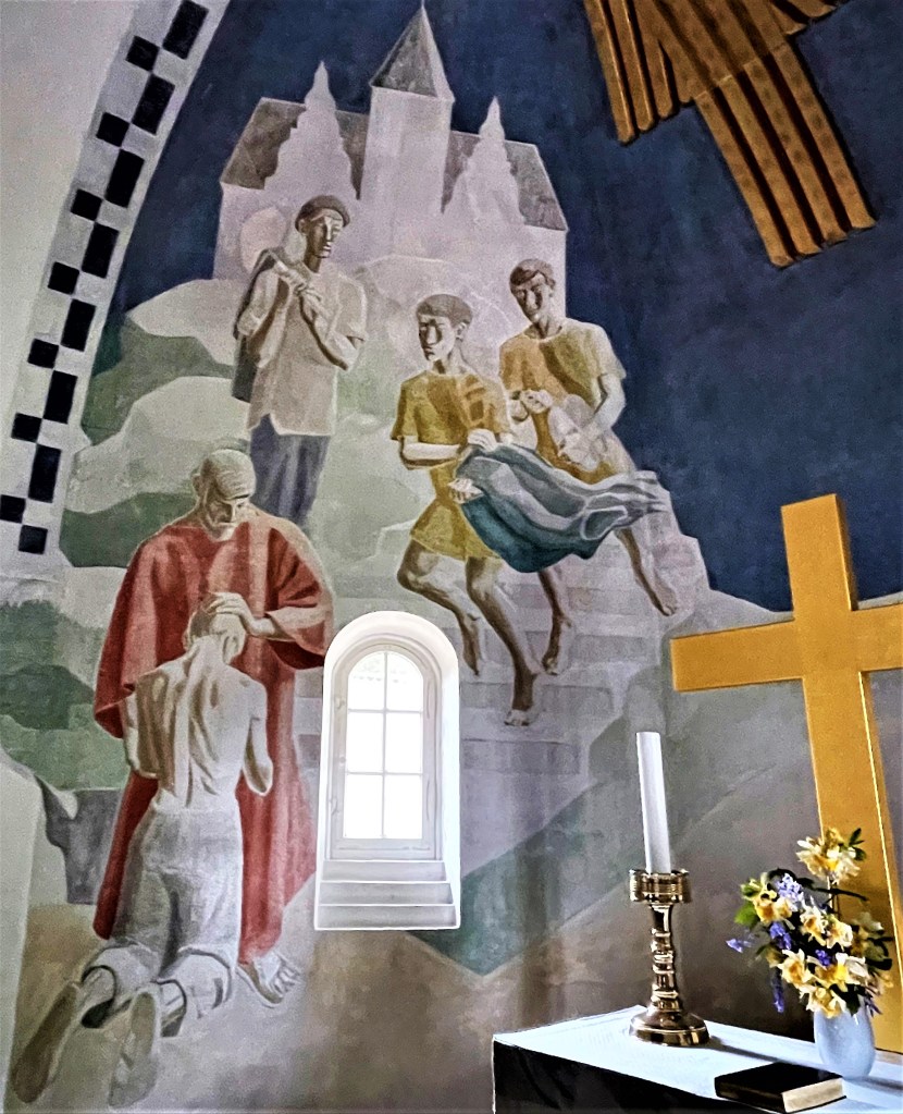 Et af ret få eksempler på den fulde billedfortælling ses i den grundtvigske Rødding Frimenighedskirke, hvor Viggo Guttorm-Pedersen i 1957 malede sin fortællende apsisfresko med ‘den fortabte søn’ mod nord og ‘den barmhjertige samaritaner’ mod syd (se nedenfor). Vort hovedmotiv er den rødklædte fader, alvorligt velsignende sin yngste søn, som knæler i andagt – et identifikationsmotiv for menigheden ved alterskranken. To tjenestedrenge efterkommer med næsten komisk hast instruksen om straks at hente festdragt og sko. I baggrunden ses himmelborgen som et lille renæssanceslot, lysende mod den kongeblå himmel med ledestjernen i forgyldt stuk. I mellemgrunden kommer den ældre bror gående, list grå og forslidt. Hvornår forstår han, at også han er elsket? Viggo Guttorm-Pedersen (1902-1962) blev undervist på Kunstakademiet af Ejnar Nielsen og Sigurd Wandel. Han har illustreret bøger og blandt mange andre offentlige værker malet yderligere en kirkeudsmykning i Bredsted syd for grænsen. Han er far til kirkekunstneren Niels Guttorm-Pedersen. Fotos: Claus Jensen.