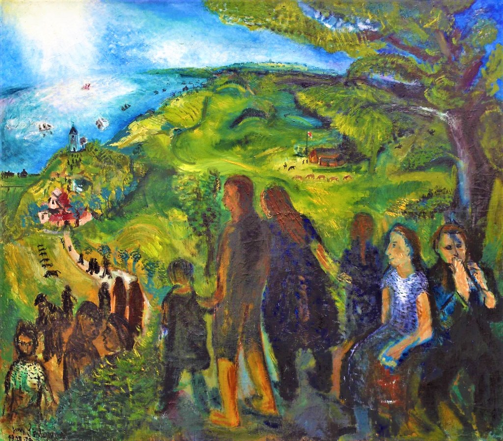 ‘Jeg er egentlig bedst, når jeg er helt alene’, skrev Benny Andersen om den krævende daglige øvelse i at være god. ‘Jeg er nu nået op på en time, hvis jeg ikke bliver forstyrret’. Hos Benny Andersen bobler det vidunderligt af selvironisk dansk humor med alvor under. Den rungende, fuldtonende alvor finder vi derimod i bjergprædikenens eksplicitte fordring om uforbeholden godhed som både næstekærlighed og fjendekærlighed: “Elsk jeres fjender og bed for dem, der forfølger jer, for at I må være jeres himmelske fars børn”. Bjergprædikenens radikale etik har en ærefrygtindgydende større skala end den overkommelige afbalancerede gensidighedsmoral, vi helst administrerer. Vi lever ikke op til fordringen om næste-, endsige fjendekærlighed, hvis vi ‘bliver forstyrret’. Når vi rystes af nyheder om meningsløs vold, eller når vore kære og vi selv bliver ramt, rykker den retfærdige vrede foran kærligheden. – Jeg ser i disse dage på præstelige facebooksider, hvordan kolleger arbejder med at forbinde bjergprædikenens ord om fjendekærlighed med de aktuelle erfaringer af ondskab, fx i nyskrevne bønner om omsorg og trøst i smerten og hjælp til at tilgive. Tænksomt og følsomt skrives fjendekærligheden ind som noget, kun Gud kan virkeliggøre. – Ingen af os kan jo i egen ret udtale ordene: “Du skal elske din fjende!”. Jeg griber til en gengivelse af K. E. Løgstrups refleksioner i ‘Den etiske fordring’: Den radikale og ensidige fordring kan det ene menneske ikke give mund og mæle over for det andet menneske, lige så lidt som påstanden om, at den er til at opfylde. Vi kan jo ikke tale på tilværelsens vegne til hinanden. I Jesu forkyndelse hører vi imidlertid et menneske, der tager tilværelsens fordring i sin mund som Guds og sin egen fordring med den mest udtrykkelige fremhævelse af radikaliteten heri. Med hvilken ret? Jesu fordring om næstekærlighed kan ikke skilles fra hans forkyndelse af Guds tilgivelse. Og vores genstridige påstand om, at kærlighedsfordringen ikke er til at opfylde, modsiger han ved selv at opfylde den til det yderste. Løgstrups sammenfatning lyder: “Den kærlighed, som vort liv er anlagt på, men som vort selv er een eneste modstand imod, er guddommelig virkelighed midt i vor modstand mod den.” – I dagens tekst lader Jesus os løfte blikket mod alt det givne liv under himlen på denne dyrebare klode, som vi ikke skylder os selv: Gud “lader sin sol stå op over onde og gode og lader det regne over retfærdige og uretfærdige.” – Kan jeg finde et dansk kunstværk, som hylder denne kærlighedsfulde virkelighed, som hinsides retfærdighed bærer vore liv? Mit valg falder på det ekspressionistiske maleri “Søndag”, skabt i 1922-28 af den farvestærke, autodidakte maler Jens Søndergaard (1895-1957). Billedet er set og formidlet på det dejlige Randers Kunstmuseum. Maleriet udtrykker en jubel over landskabet til vands og til lands under sommersolen. Kvæget græsser omkring gårdene, og småbåde sejler på fjorden. Mennesker skildres i tillidsfulde fællesskaber. Nogle færdes på vejen til eller fra kirken, der ligger som en landkending på bakketoppen. Vi ved, at der fra gudshuset nu som dengang skal lyde en fordring om både næste- og fjendekærlighed sammen med evangeliet om, at vi altid allerede er elskede af Gud. – Farverne, der fryder øjet, er for resten også en gave.