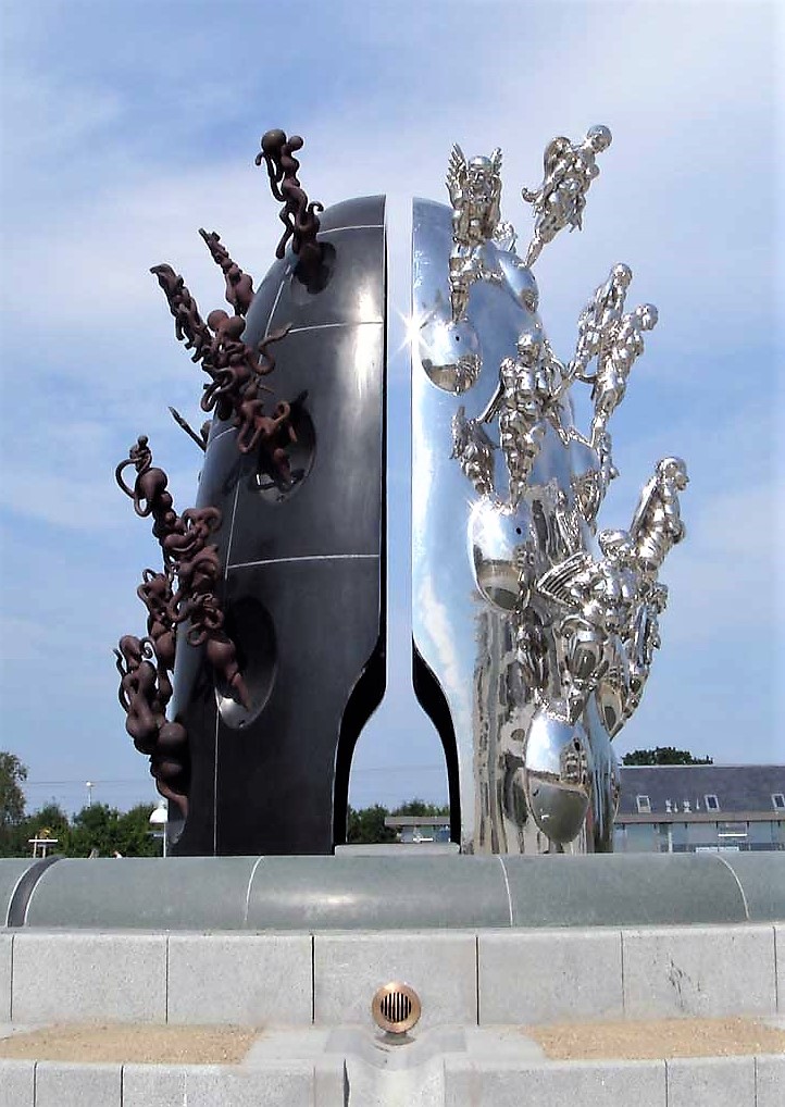 I 2010-12 skabte Bjørn Nørgaard den store skulptur “Nøglehullet” til Søndergårdtorv i Måløv. Det er et stykke monumental vandkunst, hvor vandet risler gennem spalten, som fra nederst til øverst deler skulpturen i to. Den ene side er mørk, formet i sort granit, den anden blank i rustfrit står. Skulpturens rundede udvendige flader er befolket med 24 skulpturer: på den mørke side 12 forvredne bæster, der minder mig om Luthers analyse af, hvordan mennesket kan være indkroget i sig selv. På den anden side reflekteres lyset i lige så mange englevæsener, som står ranke med synlige vinger. De dæmoniske væsener kommer frem af en fordybning i overfladen, op af hver sit mørke hul; de englelige derimod står på rundede forhøjninger. Kunstneren har fortolket skulpturen med ordene: “Gennem livet møder vi både engle og bæster, i os selv og uden for os selv, hvor moderne og oplyste vi end er. Skulpturen “Nåleøjet” giver i sin form og materiale et mangetydigt billede på de tusinder af valg vi som individer træffer hver dag, hver time og hvert minut.” – For resten kan små mennesker faktisk godt passere gennem vandet i nåleøjets spalte.