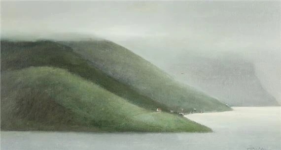 Her vælger jeg – endnu engang – et maleri af den formidable færøske kunstner Sigrun Gunnarsdottir. Det har titlen “Fjeldet” og er angiveligt købt af Ny Carlsberg Fondet til et museum. Jeg ser motivet som sakralt. Neden for det lysende, grønne fjeld ligger på sin egen klippetop en lillebitte, hvid kirke. Den ligger i læ af det store fjeld med den hvide top, som er betryggende omgærdet. Med næsten religiøs blufærdighed er bjergtoppen let sløret af en tågesky, men solen får magt, og smeltevandet løber fra bjerget som en livskilde, næsten som en navlestreng til det ukuelige lille gudshus ved bjergets fod.