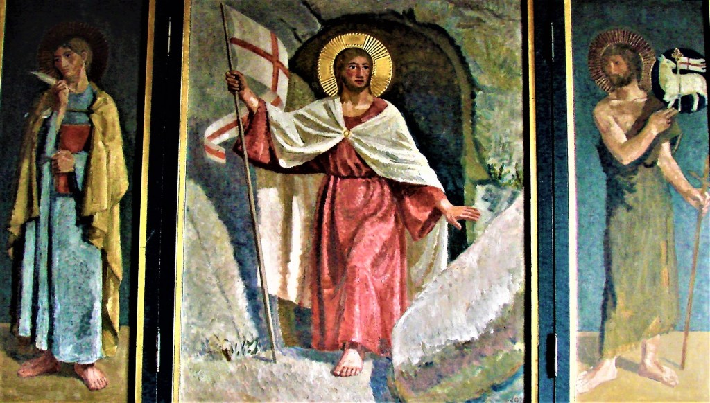 Evangelierne følger som bekendt Jesussporet, og når de hædrer Døberen undervejs, er det som forløberen for Messias. Døberen citeres for selv at henvise til Jesus som den større og som Guds lam. Døberen fylder ikke meget i dagens folkekirkekristne bevidsthed, men til gengæld er han bevaret i kirkekunsten. Her er Johannes – ligesom evangelisterne – med til at vende opmærksomheden til Jesus Kristus. Den udvalgte altertavle viser hhv. Døber og evangelist malet på fløjene omkring et prægtigt Kristusbillede. Altertavlen findes i en af landets mindste kirker, den senmiddelalderlige kirke i Egens, Syddjurs, hvorfra der for resten er formidabel udsigt over Kalø Vig. Som manifestation af Guds evige visdom og frelsesvilje skildres Kristus som opstandelseshelten med sejsfanen, mens stenene sprænges fra hans grav påskemorgen. Dette maleri af det mytiske drama er signeret 1928 af Johan Thomas Skovgaard (1988-1977). J. Th Skovgaard har udsmykket hele 42 danske kirker, mange med fremragende glaskunst. I de unge år var han stærkt præget af sin far Joakim Skovgaard, som han arbejdede for i Viborg Domkirke. Lige som faderen hentede han inspiration i byzantinsk og middelalderlig kunst. Det fremgår fx af hans glorier: de flotte, cirkelrunde, forgyldte stukglorier. Kristus bærer til forskel fra Døberen en korsglorie. Visdommens gerning var også at skabe håb i døden. Foto: Claus Jensen