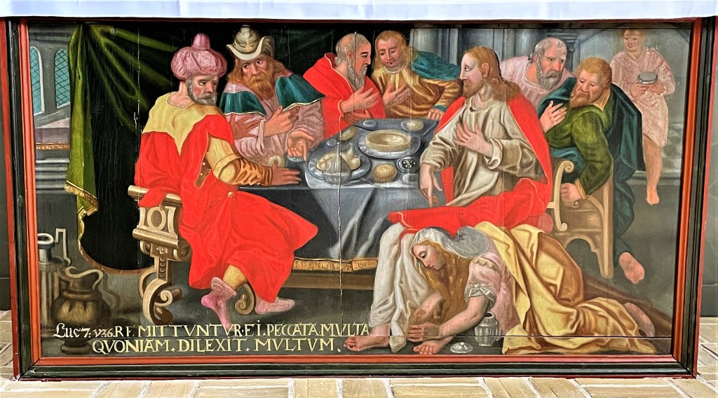 De foregående år har jeg vist nyere danske billedtolkninger af Salvningen i Simons hus, malet af Johs. Kragh og af Joakim Skovgaard. Denne gang skal vi se et billede fra renæssancen, som tilmed citerer Lukas’ prædiketekst på latin. Det er den livfulde alterbordsforside i Ballum Kirke ved Tønder. Maleriet er malet i første del af 1600-tallet og istandsat 1926 af Niels Thermansen. Maleriet kopierer den flamske maler Marten de Vos (1532-1603), som selv var inspireret af italiensk renæssance. Hans tilgængelige billeder var efterspurgt hos både protestanter og i den katolske modreformation. Hans udbredelse i Europas kirker skyldtes for en stor del den flamske gravør Raphael Sadelers kobberstik, således også her. Resultatet i Ballum er i alt fald et farverigt, livligt og fortællende ‘historiemaleri’. Rundt om farisæerens bord ses gestikulerende herrer med skepsis eller nysgerrighed malet i ansigterne. Til højre i forgrunden ser vi den roligt kommunikerende Jesus, klædt i lyse farver, lige som kvinden med salvekrukken og det honninggyldne hår. Hun er opslugt af sit herlige forehavende: at bevidne og hylde Kærligheden. Foto: Claus Jensen