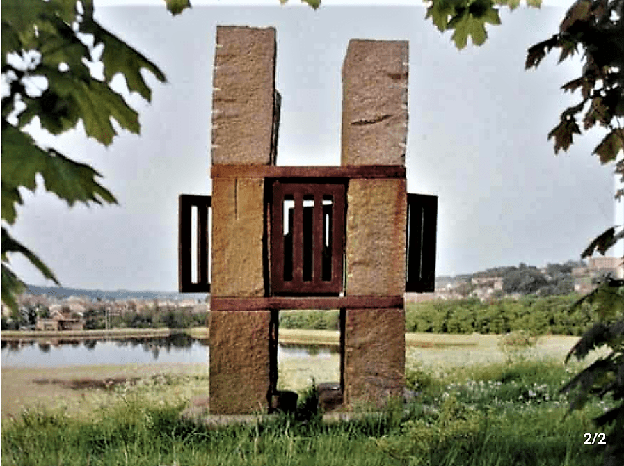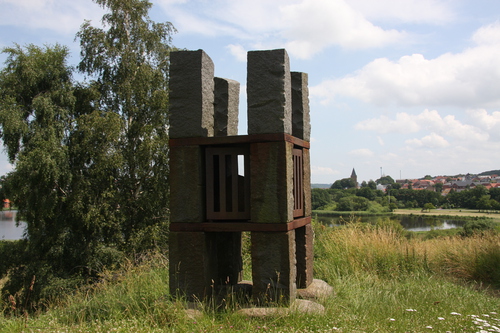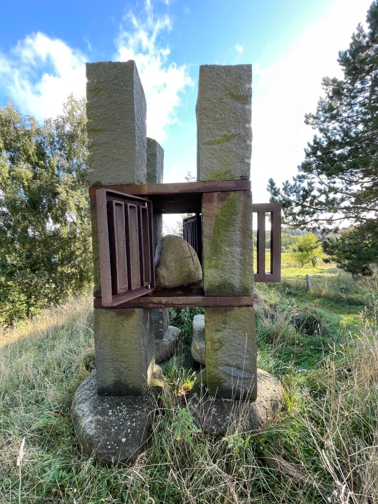 Her viser jeg nu en moderne abstrakt skulptur fra 1978 af dansk kirkekunsts grand old man Erik Heide. Det er “Håbets bur” af granit og støbejern, af form som et H (HÅB), placeret smukt og højt ved Gattenborg uden for Hobro med udsigt ned til Vestfjorden. Umiddelbart ser ‘buret’ håbløst lukket ud, som et fængsel. Kommer vi nærmere, opdager vi, at buret indeholder en stor sten med et kors. Stenen er for stor til at kunne fjernes fra buret, sådan som livets smerte og sorg ikke altid lader sig fjerne. Men det viser sig, at de tunge støbejernslåger alle kan åbnes, som symbol for at mennesket ikke behøver være lukket inde i håbløsheden. Skulpturen er interaktiv og tvetydig: Jeg talte med en kunstkender, som ytrede, at man jo selv må handle og opsøge håbet; man må slå lågerne op. Min egen umiddelbare tolkning var, at kræfter udefra (eller oppefra) kan komme det plagede menneske til hjælp og åbne håbets vinduer. I alt fald er den åbne skulptur et talende symbol for, at håbet ikke skal gøres til skamme. Hvor håbet først har fundet vej, er livet ren mulighed, og udsynet under den åbne himmel er uendeligt. Foto: Claus Jensen.