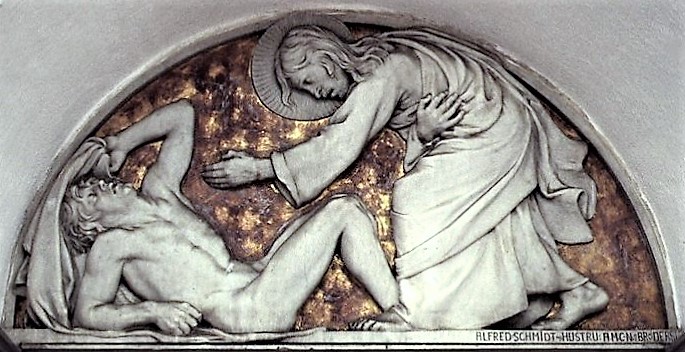 Anne Marie Carl-Nielsen, f. Brodersen, (1863-1945) havde allerede i 1890’erne arbejdet på relieffer med motivet Lazarus’ opvækkelse. I 1927 kom et af hendes gipsarbejder i anvendelse som udsmykning over indgangen til Kristkirken i Kolding. Tilpasset rammens cirkeludsnit fremstilles Kristus her dybt bøjet på vej ind graven til den unge Lazarus. – Det kan samtidig tolkes som et varsel om Kristi egen snarlige gravlæggelse.- I scenen med Lazarus’ opvækkelse har Kristus strakt armen frem i en livgivende bevægelse, som kan minde om Skaberens overrækkelse af livsgnisten til Adam i Michelangelos fresko i Det Sixtinske Kapel. Kristus er skildret fokuseret og koncentreret om underet: Den liggende unge Lazarus løfter overkroppen, endnu tilbagelænet og med lukkede øjne, og rykker ligklædet til side. Om et øjeblik skal hans søstre genforenes med deres levende bror. – På det kirkelige område er A M C-N bedst kendt for udsmykningen af Ribe Domkirkes bronzeporte med relieffer, hvoraf hovedmotivet også findes i gips i Sønder Stenderup Kirke, kunstnerens fødesogn. Det aftvinger største respekt at læse om kvindelige kunstneres møjsommelige vej til uddannelse og karriere. Som tidens andre kvindelige kunstnere måtte Anne Marie Brodersen / Carl-Nielsen mobilisere en hel del stædighed for at bringe sit store talent til udfoldelse. Som ung blev hun optaget på Tegne- og Kunstindustriskolen for kvinder, som var grundlagt 1876 af Vilh. Klein, der citeres for udtalelsen: “At kvinder har samme evner som mænd, vil næppe nogen påstå”. Hans kvindelige elev blev dog hans overmand, som det vist stadig hedder også om suveræne kvinder, ak ja. Foto: Claus Jensen.