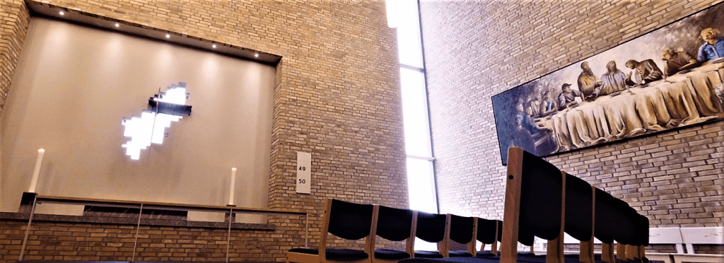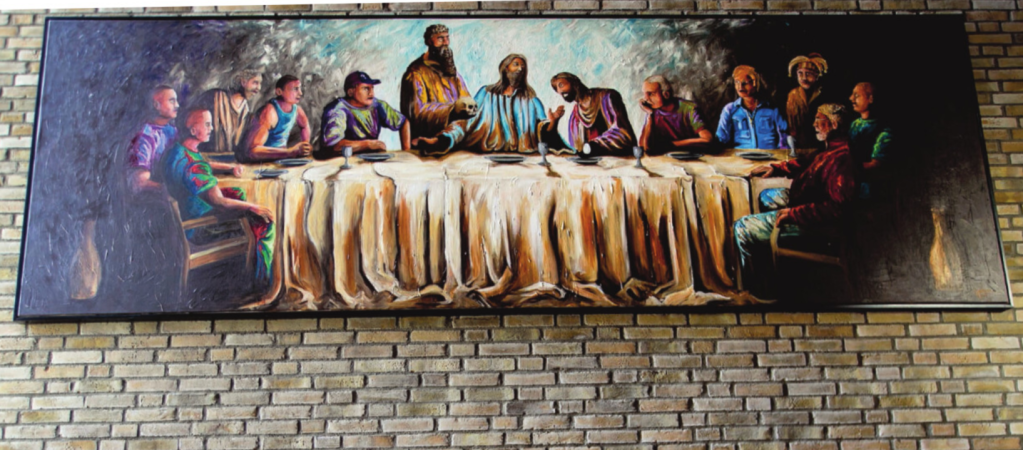 I fængselskirken i Enner Mark, Horsens, hænger Jan Jochims Nielsens nadverbillede, som er malet 2013. Jan Jochims Nielsen er fhv. HA-rocker og har afsonet 12 år for narkokriminalitet, men kan nu ernære sig som maler. Maleriet viser en genkendelig Jesus siddende midt for langbordet med armene rakt ud til sine bordfæller. Som de tolv disciple figurerer malerens medfanger, der afsoner domme for økonomisk kriminalitet, vold o.a. Kirkerummets udsmykning symboliserer, at “Gud vil have med alle at gøre”, sagde fængselspræst Jesper Birkler til KD d. 25.-4.-22, og “de indsatte er sultne efter mening”. – I forvejen havde kirkerummet Øjvind Nygaards (d. 2010) stærke udsmykning fra 2006 på altervæggen, der er gennembrudt af en klar rude med udsyn til friheden og et tredimensionelt kors som symbol for livets tungeste byrde og ikke mindst for Guds tilgivelse. Foto fundet på nettet.