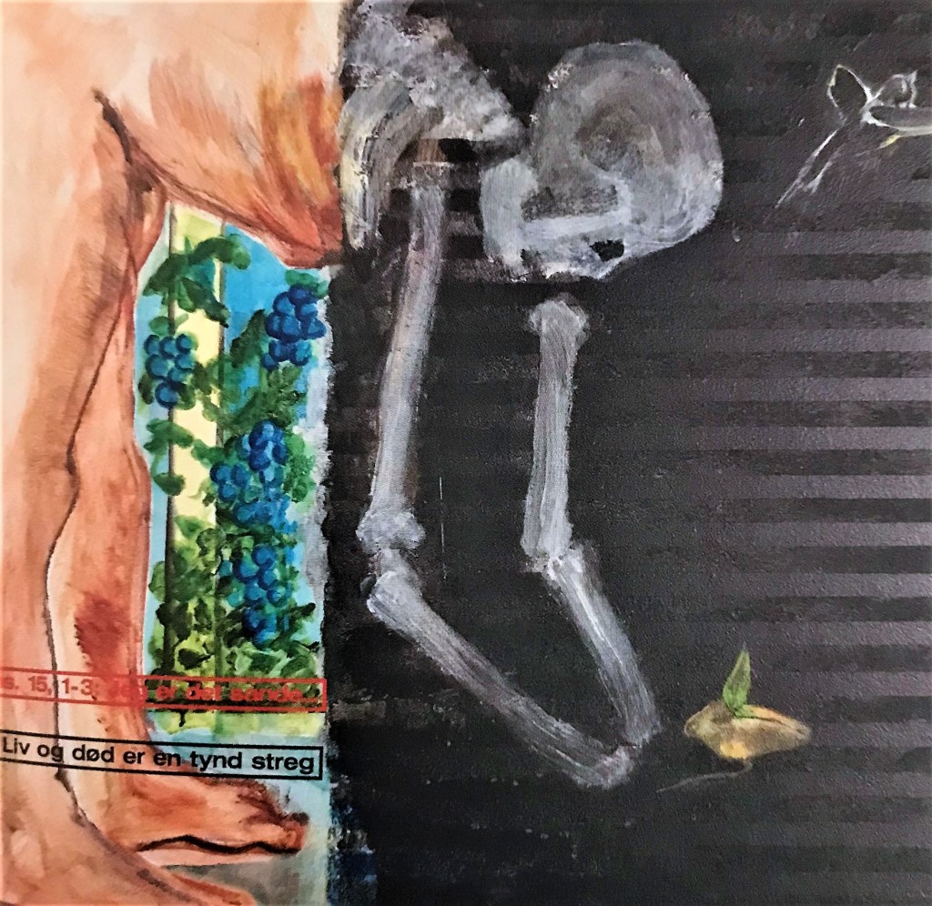 Omkring 2006, før Erik Hagens blev egentlig kirkekunstner, udsmykkede han med “Esbjergevangeliet” læreruddannelsens hall i University College i Esbjerg, bl.a. formidlet med billeder og tekster i bogform i Egon Clausens ‘Almanak’. I et anarkistisk virvar af oftest samtidskritiske billeder kan vi her og der få øje på en frapperende og tankevækkende sammenstilling af motiver, således i dette billede af ‘Den tynde streg mellem liv og død’. Billedets venstre halvdel viser os den frodige og frugtbare paradishave eller vingård med en påtegnet reference til Jesus som “Det sande vintræ”. I billedets sorte, højre side har døden høstet. Den unge krop er forvandlet til skelet, MEN den døde viser en livsduelig spire i sorten muld. Med en bibelsk værktøjskasse kan vi associere til messiasforventningens løfte om, at “der skyder en kvist fra Isajs stub” (Es. 11) eller til Jesusordet om hvedekornet, der må dø i jorden for at “bære mange fold” (Joh. 12). Erik Hagens billede af paradistabet er således også et håbsbillede. Og i øverste højre hjørne stiger ydermere en fugl mod himlen som et håbstegn, jævnfør duen med det grønne olieblad, der bragte håbets ånd til Noa efter den gamle verdens undergang i syndfloden.