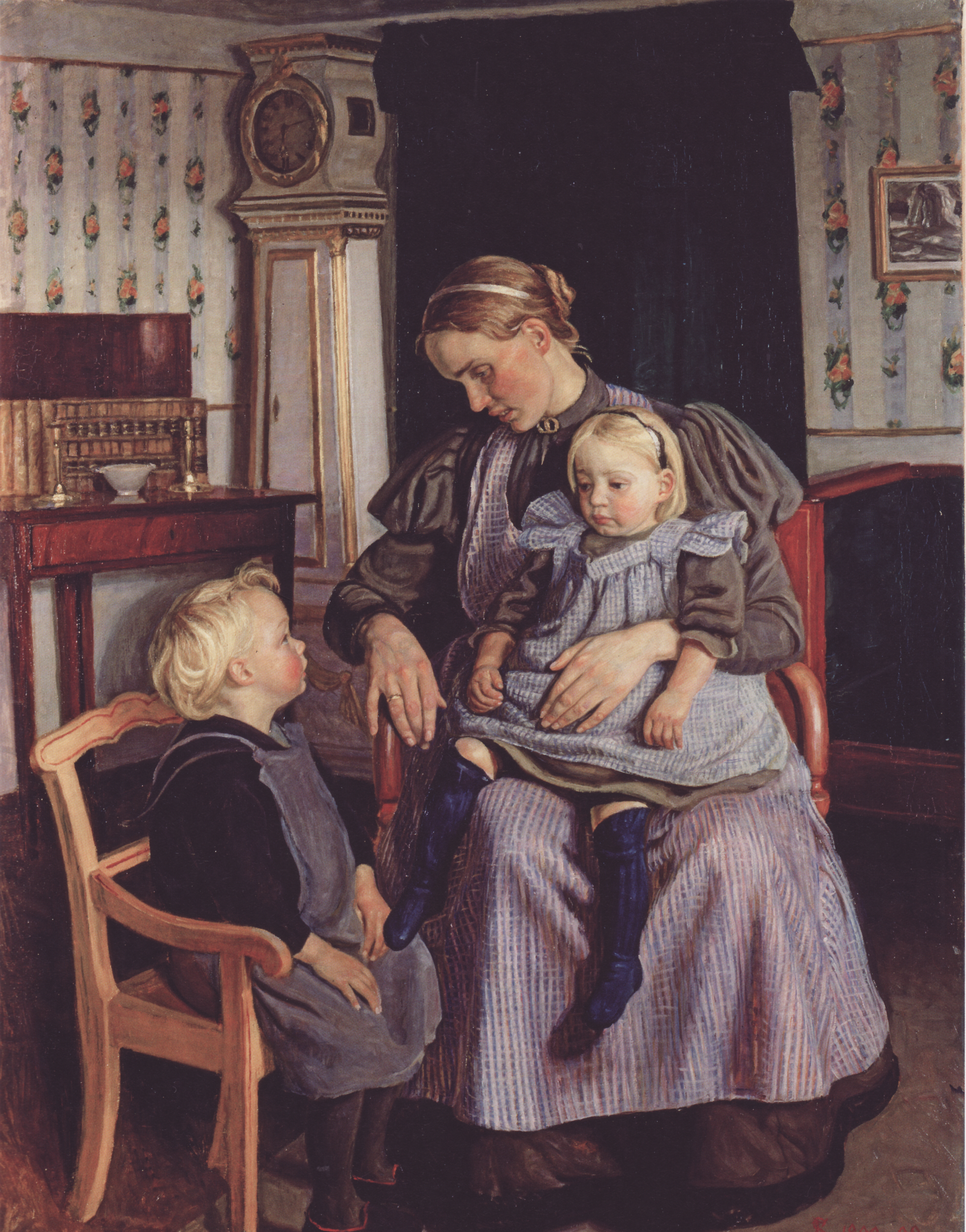 Jeg har søgt efter et kunstværk, helst ikke for sentimentalt, der viser et barn i dets sårbarhed og sjælelige åbenhed for, hvad de voksne giver det. Jeg faldt tilbage på et af mine yndlingsbilleder, en huslig scene med hustru og børn malet 1898 af fynbomaleren Fritz Syberg: “En mor, der fortæller sine børn historier”. Se på det lille, åbent lyttende barn på stolen til venstre og på den diagonale linje mellem barnets og moderens blik! Billedets sorgfulde baggrundsmusik blev, at moderen, kunstneren Anna Syberg, døde allerede som 40-årig efter at have født 7 børn. Tiden med børnene var og er kostbar. Se kunstværket nederst i opslaget.