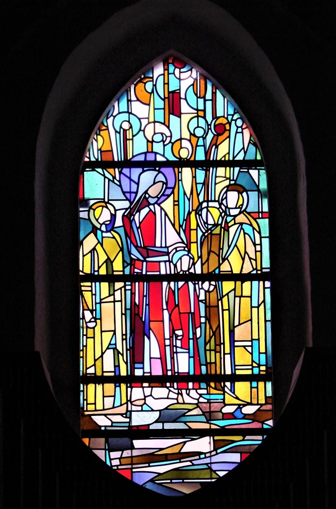 Mit primært udvalgte billede er Gerda Swanes glasmosaik fra 1961 i tårnrummet i Grevinge Kirke, Odsherred. Gennemlyst af dagslyset, Guds eget lys, viser det stiliserede kunstværk en scene fra dagens tekst: Barnet står roligt, i rudens midterakse. Den handlende er Kristus, der viser barnet til de omkringstående, mens børnenes engle i himmelen smukt fylder rummet over deres hoveder. Gerda Swane (d. 2004) var i øvrigt især en dygtig portrætkunstner. Hun stiftede ikke selv familie, men boede det meste af sit liv på Swanernes malergård, som ligger i kirkesognet. Uden for kirken ses gravstenen for Sigurd Swane, Gerdas far. Faderen forbandt sig ikke med kristendommen, som han mente ‘havde udspillet sin rolle’. Når han malede sine berømte ekspressionistiske himmelstiger, var det snarest hans personlige symbol for livsomvæltning og kunstnerisk forløsning. Derimod valgte Gerda, angiveligt som den eneste i familien, at tilslutte sig kristendommen, nærmere bestemt katolicismen, og en tid prøvede hun tilmed kræfter med et krævende klosterliv. Det lykkedes hende at sikre Malergården som museum, som vi er mange, der har haft glæde af at besøge. Kig så også lige ind i Grevinge Kirke, hvis altervæg for øvrigt er malet af Niels Larsen Stevns. Foto: Claus Jensen.