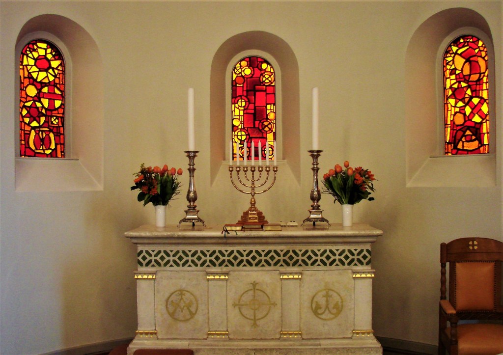 Flere steder finder vi glaskunst af Sven Havsteen-Mikkelsen med netop titlen “Tegn i sol, måne og stjerner”, mest udførligt i Ordrup Kirkes apsisruder fra 1969. Her møder vi en overdådighed af sol, måne og stjerner i opmuntrende varme farver. Den centrale rude bærer et stiliseret kors, der holder os fast på Kristus som ledestjernen, og vi kan også få øje på kors, trekant og andre gudssymboler i ruderne til venstre og højre. Betlehemsstjernen er der tydeligvis også. Foto: Claus Jensen.