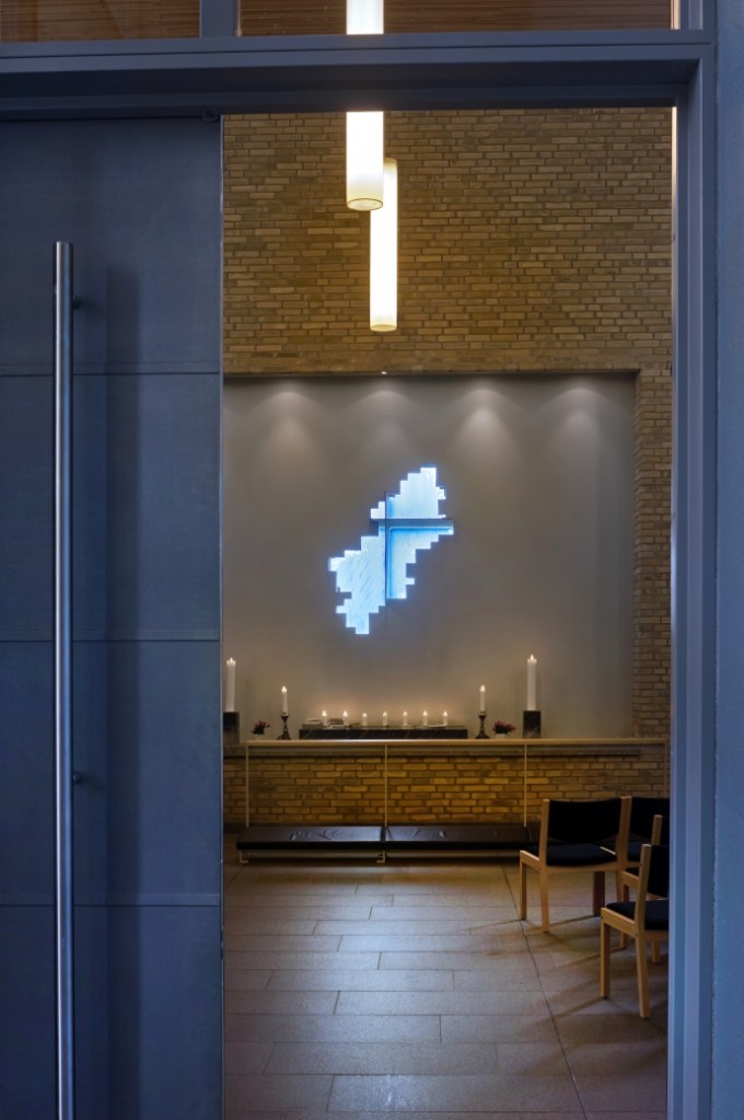 Jeg har i tidligere opslag vist Rudolf Rud-Petersens vidunderlige figurative maleri fra 1915 af Johannes i fængslet. Denne gang vises et moderne kunstværk fra 2006, som findes i kirken i Statsfængslet Østjylland, Enner Mark. Øjvind Nygårds (1948-2010) skulptur i bronze og glas bryder hul i muren med et uregelmæssigt vindue med et kors, synligt både indefra og udefra. Forhåbentlig kan korset med lysindfald og udsyn til himlen opleves som et nådefuldt glimt af håb for en spørgende sjæl bag en låst dør? Foto er hentet i Mikael Wivels flotte værk Kunsten i kirken samt på nettet.