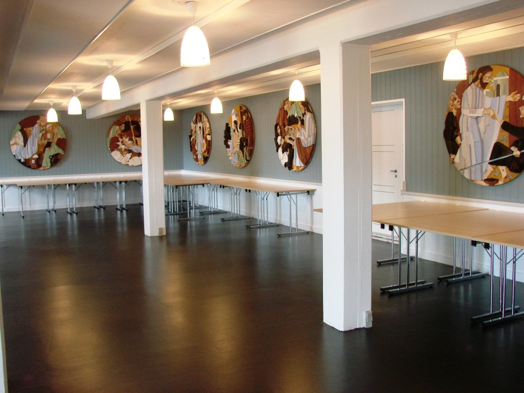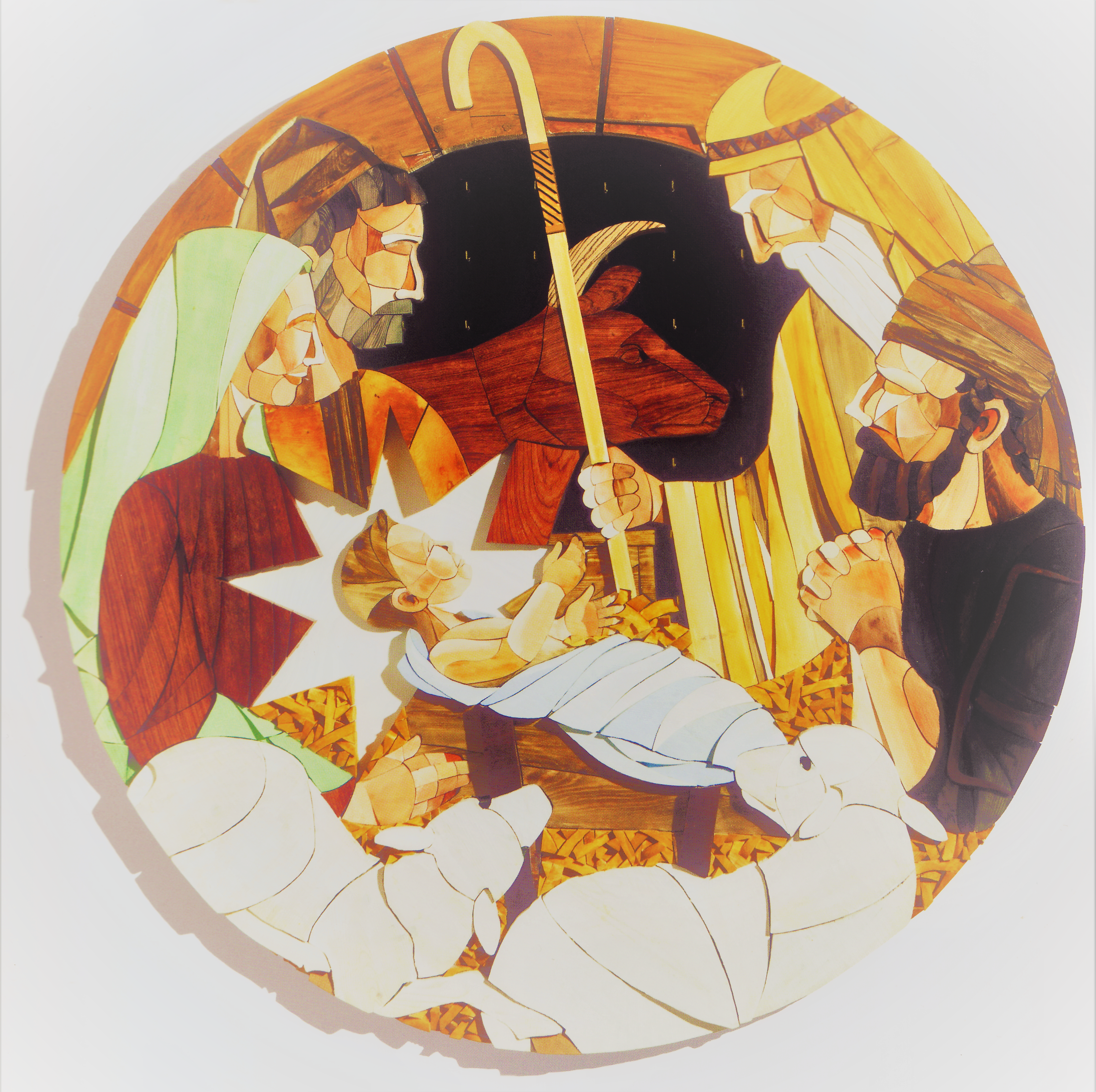 Gudsrigets åbne port vises i værket “Hyrdernes tilbedelse”, som hænger i Christianskirken i Klaksvig, Færøerne. Det både traditionelle og postmoderne collageagtige relief med forskellige træsorter og metalgenstande er skabt med både kloge hoveder og kloge hænder af billedkunstner Edward Fuglø (f. 1965) og møbelsnedker Sjurdur Solstein. I alt 10 tondoer (cirkelrunde kunstværker) med billeder af Jesu liv hænger i kirkens nederste etage. De blev færdige i 2013 til kirkens 50 års jubilæum. Hyrderne følger englekaldet: “Og dette er tegnet, I får. I skal finde et barn , som er svøbt og ligger i en krybbe”. Vi får et udblik til den sorte nat, hvor stjernehimlen illuderes af en plade til nøgleophæng med små messingkroge. Midt i billedet ses koen (ref. Es.1,3: “Oksen kender sin ejer”…) og hyrdestaven, som Jesusbarnet symbolsk rækker ud efter. Han skal blive “den gode hyrde, der sætter sit liv til for fårene”. Barnet er “lyset, der skinner i mørket”, og barnets glorie associeres også til Betlehemsstjernen. – I øvrigt er kirken bedst kendt for sit alterbillede, der er en succesrig genanbringelse af Joakim Skovgaards første, men aftagne, fresko af Det Store Gæstebud til Viborg Domkirke 1901. Netop træ fra Skovgaardbilledets blændramme er for øvrigt genanvendt i Fuglø-billedets rundbuede portal, som flugter med billedranden. – Billedet er fundet i den flotte bog ‘Træets budskab. Jesus fra Nazaret – en kirkeudsmykning af Edward Fuglø”, som jeg blev foræret af kunstsnedkeren Sjurdur Solstein. – – Vi hørte for nylig om voldsomt snefald, voldsom regn og efterfølgende laviner i Klaksvig, der førte til evakuering af de højest beliggende boligområder. Nu sænker julefreden sig forhåbentlig i Klaksvig og over verden. Glædelig jul til alle.