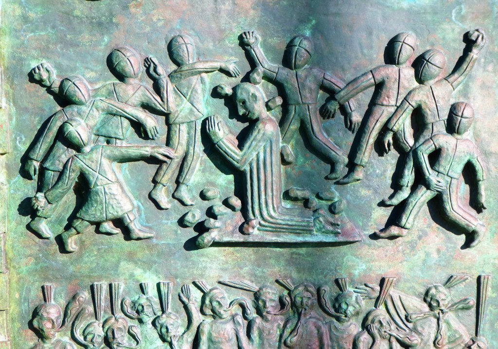 Det sker ikke ofte, at billedkunstnere nyfortolker Stefansmotivet. Men det er netop, hvad Bjørn Nørgaard gjorde i 2020 på den righoldige bronzeport Alfa og Omega i Christianskirken, Fredericia: Over relieffet med pinsedagens åndsudgydelse ses forskellige urkristne motiver fra Apostlenes Gerninger, herunder altså Stefans stening. Relieffets figurer er tidløst klædt og des mere nutidige. Det handler således om alle tiders brutale verdensmagter og alle tiders syndebukke og ofre. Stefan er iklædt en stribet fangedragt og knæler. Pointen er, at han ikke knæler i underkastelse under magtens og voldens udøvere. Det er ikke deres ‘nåde’, han beder om. Han knæler for sin egen Herre i Åndens frihed. Foto: Claus Jensen.