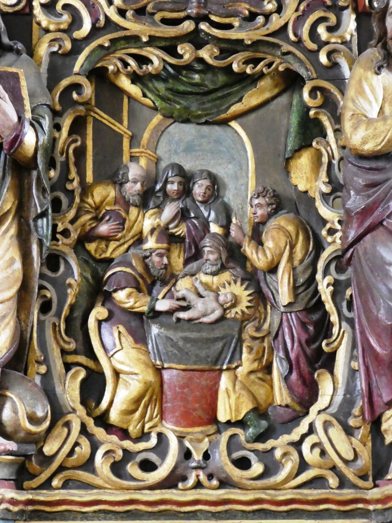 Vi kan vise et af de traditionelt fortællende billeder af Jesu omskærelse som fx den dygtige billedskærer Abel Schrøder d. y. s prædikestolsudsmykning fra 1667 i Hammer Kirke ved Næstved. Det er et ganske underholdende relief. Foto: Claus Jensen.