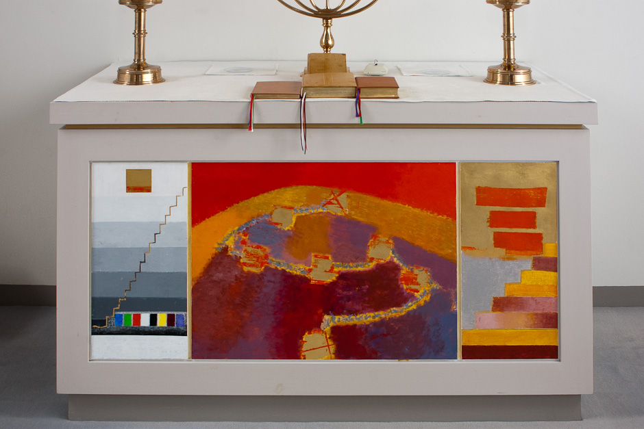 En anden mulighed er at vise et af (kirke) kunstens mange mere lyriske billeder af en vej. Her har jeg valgt en moderne abstraktion over vejen, malet af Arne L. Hansen på Øster Vrå Kirkes alterbord i 1994. Det er en udsmykning fra modernismens lidt billedforskrækkede periode. Her er ikke bare en abstrakt visualisering af vejen, men hele tre: I centrum er Lidelsens vej, Via Dolorosa, som fører Jesus ad lidelsens syv stationer op mod Golgata øverst under den røde himmel. Til venstre er Himmelstigen, som en forkyndelse af menneskeåndens rejse mod lyset, altså den lodrette eller diagonale bevægelse. Til højre ses Frelsens vej, som med lodret eller diagonal bevægelse tegner en trappe. Trappen mødes imidlertid oppefra af tre røde striber: Fader, Søn og Helligånd? Tro, håb og kærlighed? Jesu vej har betydning for vores vej. Værsgo’ at tolke med! Evigheden kommer til os. “Højtiden vokser med dagen”. Tak til Niels Clemmensen for dette foto.