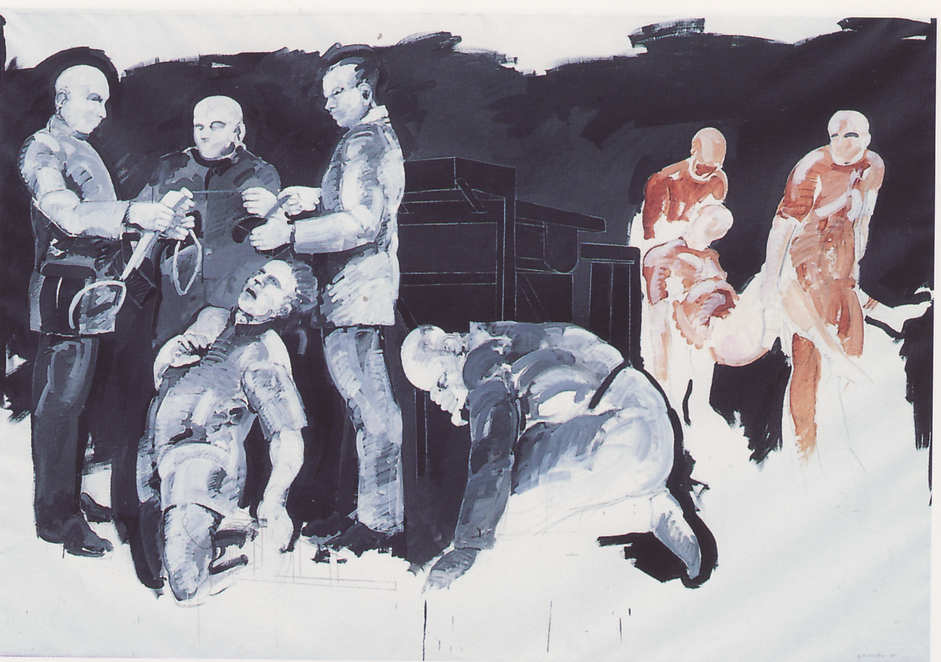 Det billede jeg har valgt, er i 1999 skabt af den eminente tegner Sys Hindsbo (f. 1944). Det er et af hendes barskeste værker og bærer titlen “Mand holder sig for næsen”. Ja, vi deler kvalmen og gruen. Sys Hindsbo har fra sin personlige biografi rigeligt kendskab til krigens og undertrykkelsens logik, og hendes kunst skildrer gerne ofre og magthavere, ofte let uniformerede mænd. Kunstværket gør os til vidner til en iskold forberedelse til en hængning og til mennesker, der bryder sammen. Måske helte, der alligevel nægtede at adlyde. Fra billederne synes spørgsmål at udgå: Er det muligt at trodse kommandostrukturer? At nægte at bøje sig for undertrykkelsens logik? At se en fremmed som et menneske? Er det muligt over de militære råb at høre en hvisken fra den højeste myndighed. Til højre i billedet ses en figurgruppe bestående af en død og to udbærere. Mon den røde farvelægning her kan læses som et forsigtigt udsagn om kærlighed og medfølelse? Om at Guds kærlighed lever med den døde?