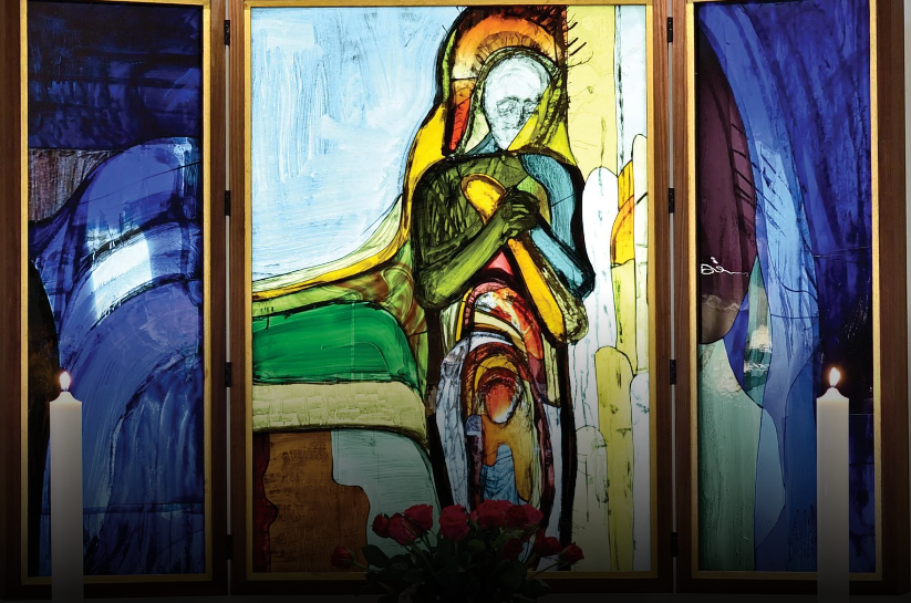 I denne uge, hvor Peter Brandes fylder 80, bruger jeg gerne et af hans værker i mit opslag til Midfaste søndag. Kirkekunstnere har på forskellig vis søgt at vise sammenhængen mellem Kristus og brødet: Hvordan anskueliggør man, at Kristus giver sig selv i brødet? Peter Brandes har i sin udsmykning fra 2022 i Den Danske Kirke i Bruxelles skabt et nyt og temmelig uhørt visuelt symbol for Kristus som livets brød, (med titlen ”Emmausmåltidet”), ved at lade Kristus holde brødet i favnen, ja bære livet i kroppen som en graviditet. ”Hver gang han bryder brødet, åbner han sit liv for os, så vi kan indtage hans måltid”, forklarer kunstneren om alterbilledet, som vises her. – Ved første øjekast var jeg ærligt talt i tvivl om, hvorvidt alterbilledet forestiller Maria eller Jesus, men tornekronen peger umiddelbart på Jesus… En ekspressiv kunstner kan imidlertid lade billedet forestille både-og i skikkelse af et fortættet og paradoksalt symbol. I sin fortolkning af billedet trækker Peter Brandes selv en linje tilbage til Kristusbarnets fødsel: Ordet blev sået i Maria, og hele tiden gentager såningen sig i vores verden, når vi hører Ordet og deltager i måltidet. Foto er fundet på nettet.