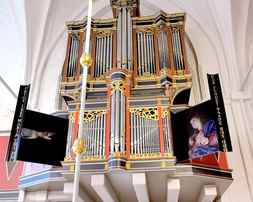 Thomas Kluge har for et par år siden malet Mariæ Bebudelse i sin karakteristiske stil: den magiske realisme. Motiverne er fordelt på to relaterede orgellåger, som har den dybsorte baggrund fælles. Dette sorte er vigtigt for Thomas Kluge som anskueliggørelse af uendelighedens dyb, der potent forbinder de malede motiver. Ja, Kluge kan finde på at kalde det sorte dyb for sine billeders virkelige motiv. På den venstre låge ses en velsignende, aristokratisk klædt underarm og hånd, som er Guds. De tre fremrakte fingre kan være et treenighedssymbol. Kluge afbilder ikke Gud uden netop som en hånd. Jævnfør hans maleri af fodvasken i Linå Kirke. På den højre låge ses den velsignede purunge pige, undselig og tillidsfuld, yndig og yndigt klædt. Hendes blik er opadvendt, og hendes ansigt er belyst fra venstre, fra Guds ‘sted’. Lågerne er skabt til at sidde på svaleredeorglet i Skt. Peders Kirke, Næstved, men er endnu ikke rigtigt kommet op at hænge. Mod kunstnerens ønske var begge maleriets felter nemlig blevet forsynet med en guldkant for at matche det i øvrigt meget forgyldte orgel. Men guldkantens blingbling overdøvede de fine nuancer i maleriet og satte et utænkeligt skel i rummet mellem den himmelske hånd og det undfangende pigebarn. Konflikten førte til en retssag, hvor kunstneren fik medhold, så mon ikke guldkanten fjernes, og billedet snart kommer højt til skue til glæde for menighed og kunstturister?