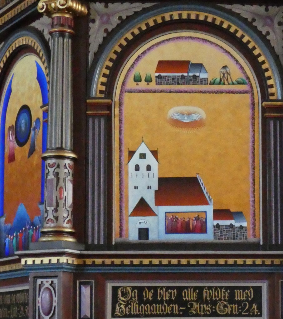 Grindsted Kirke ved Billund har 2008-13 ladet den fabulerende billedkunstner Stig Weye (f. 1946) udsmykke kirkens prædikestol og alterbord. Kirken har udgivet et fint lille hæfte om prædikestolen, hvor et af de malede felter har pinseunderet som motiv. Med citat fra Ap. G. 2,4 har kunsthistoriker Dorte Fogh bl.a. her skrevet: Pinseunderet fandt sted halvtreds dage efter påske. Da de tolv apostle alle var samlede “lød der med ét fra Himmelen en susen af et vældigt åndepust”. Helligånden bredte sig som ildtunger, der satte sig på apostlene, som straks talte fremmede sprog. Peter udlagde underet for de forundrede folk, som hurtigt samledes, og de lod sig alle døbe. Dermed opstod den første menighed, og forkyndelsen af det kristne budskab for alverden blev mulig. Stig Weye lader den skelsættende begivenhed finde sted i Grindsted Kirke under en æresportal af lyng. De tolv apostle, der er klædt i kærlighedens og ildens røde farver, står i Guds hus og peger op mod helligåndens due… Under alle omstændigheder henviser motivet til den helligåndsdue, der svæver under lydhimmelen over prædikestolen. Over kirkens indgangsdør i våbenhuset ses en stor nøgle. Det er Peters nøgle til himmerige, der kan binde og løse synden… Øverst på billedet ses i et karrigt landskab Grindsted gamle kirke, som den så ud før udbygningen o. 1922. Foto: Claus Jensen.